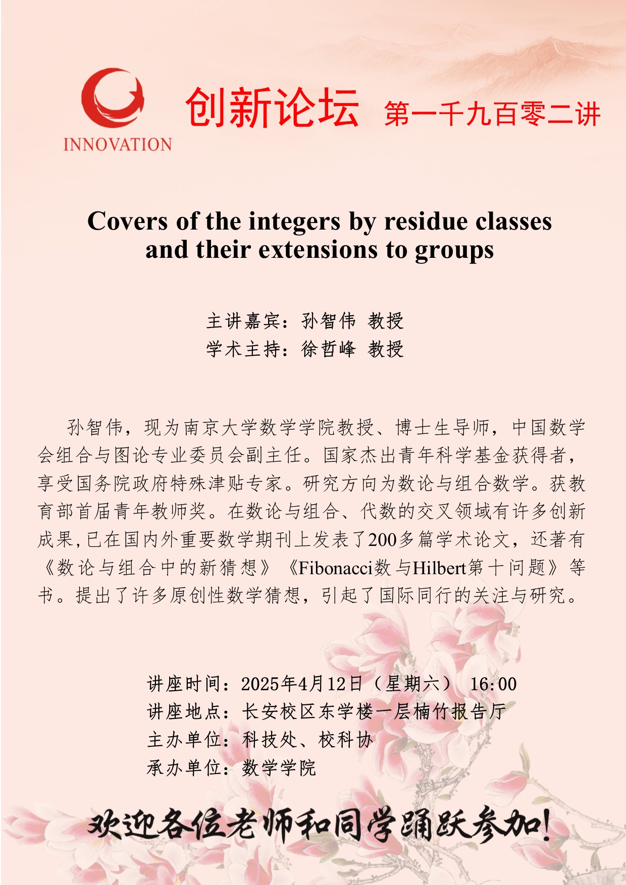 孙智伟 教授 乐动网页版登录入口创新论坛第一千九百零二讲:Covers of the integers by residue classes and their extensions to groups 讲座时间 2025年4月12日(星期六) 16:00 讲座地点 长安校区东学楼一层楠竹报告厅 讲座人介绍 孙智伟 教授 讲座内容