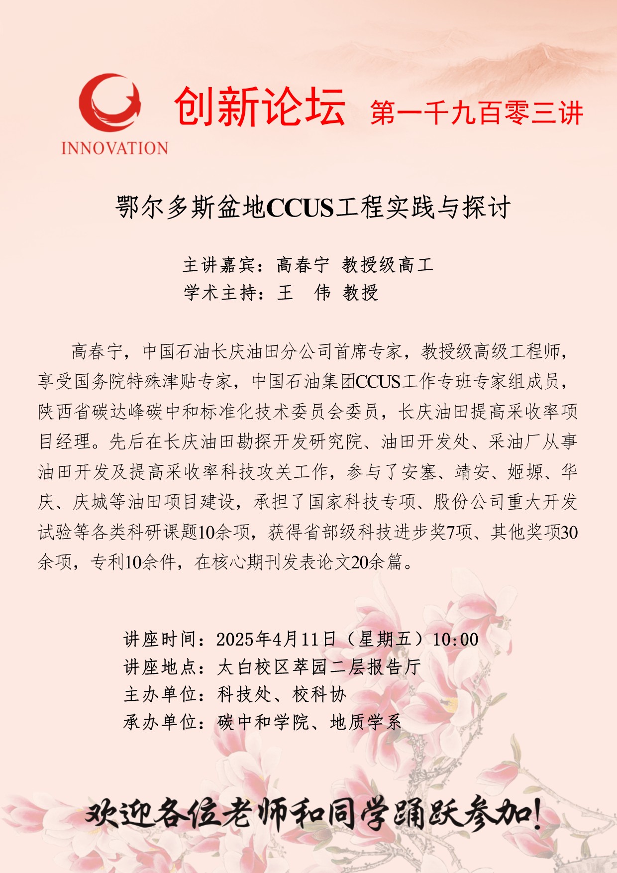 高春宁 教授级高工 乐动网页版登录入口创新论坛第一千九百零三讲:鄂尔多斯盆地CCUS工程实践与探讨 讲座时间 2025年4月11日(星期五)10:00 讲座地点 太白校区萃园二层报告厅 讲座人介绍 高春宁 教授级高工 讲座内容