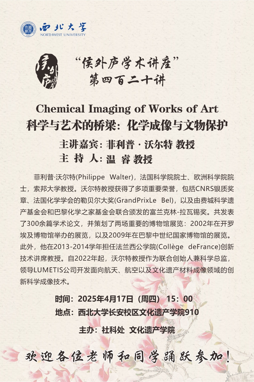 菲利普·沃尔特 教授 “侯外庐学术讲座”第四百二十讲:Chemical Imaging of Works of Art科学与艺术的桥梁:化学成像与文物保护 讲座时间 2025年4月17日(周四)15:00 讲座地点 乐动网页版登录入口长安校区文化遗产学院910 讲座人介绍 菲利普·沃尔特 教授 讲座内容