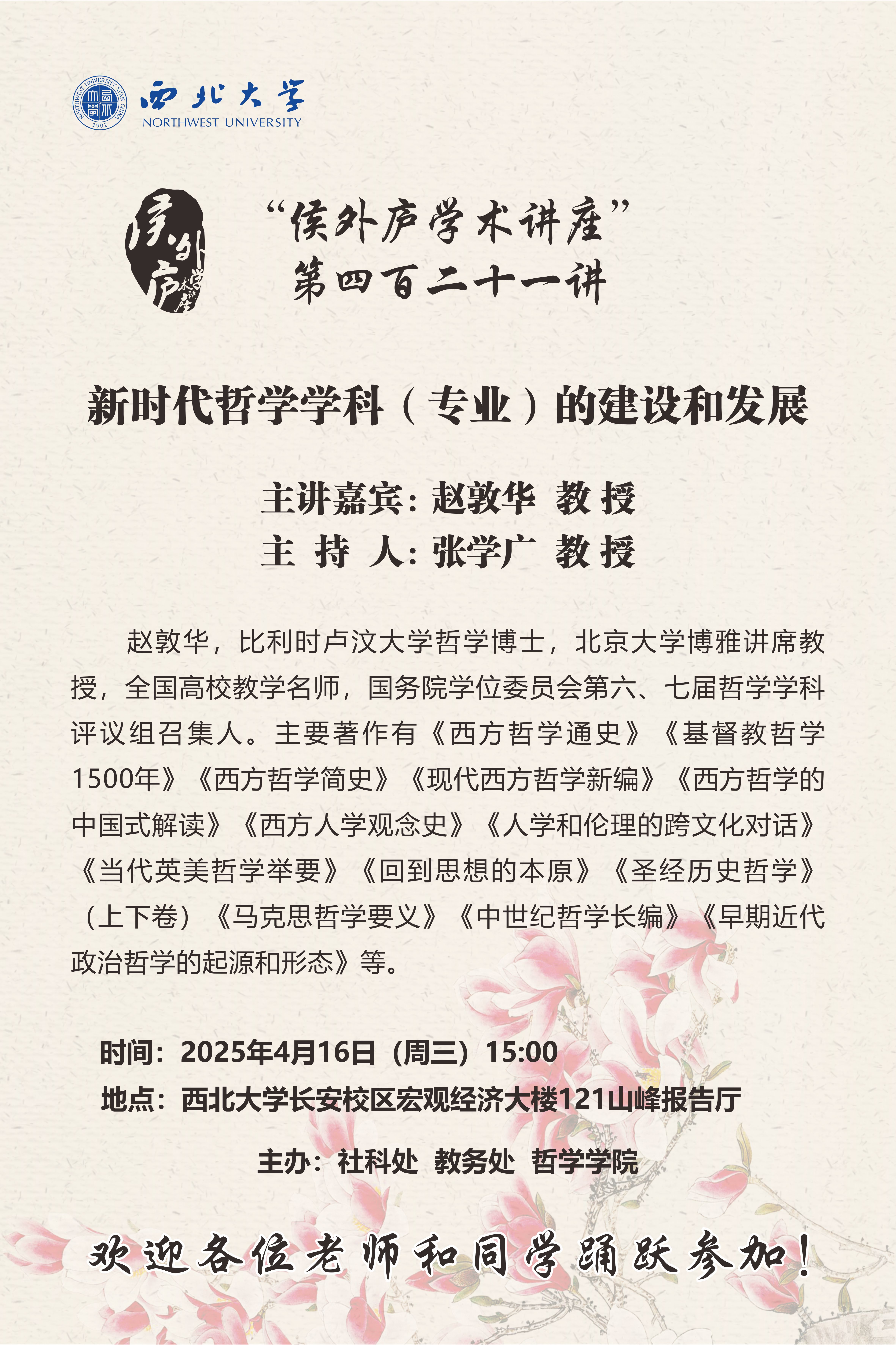 赵敦华 教授 “侯外庐学术讲座”第四百二十一讲:新时代哲学学科(专业)的建设和发展 讲座时间 2025年4月16日(周三)15:00 讲座地点 长安校区宏观经济大楼121山峰报告厅 讲座人介绍 赵敦华 教授 讲座内容