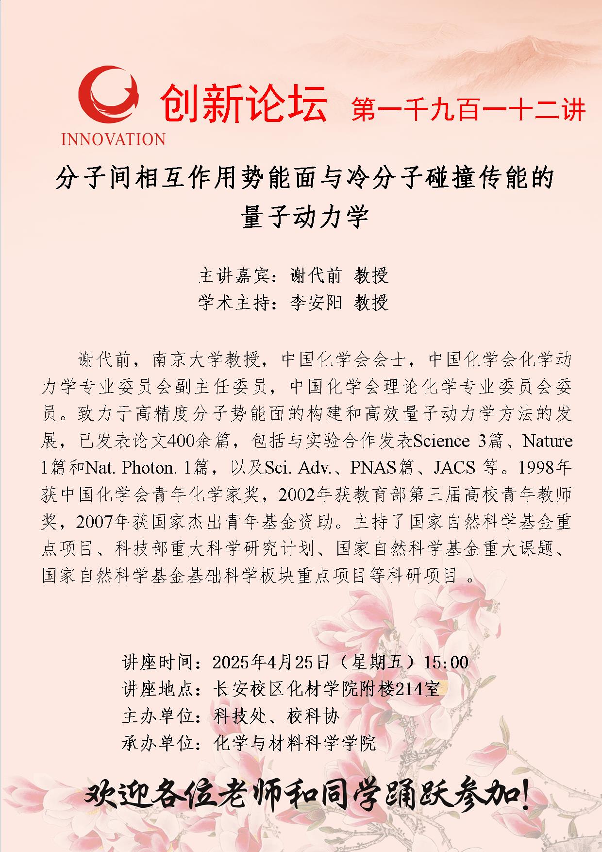 谢代前 教授 乐动网页版登录入口创新论坛第一千九百一十二讲:分子间相互作用势能面与冷分子碰撞传能的量子动力学 讲座时间 2025年4月25日(星期五)15:00 讲座地点 长安校区化材学院附楼214室 讲座人介绍 谢代前 教授 讲座内容