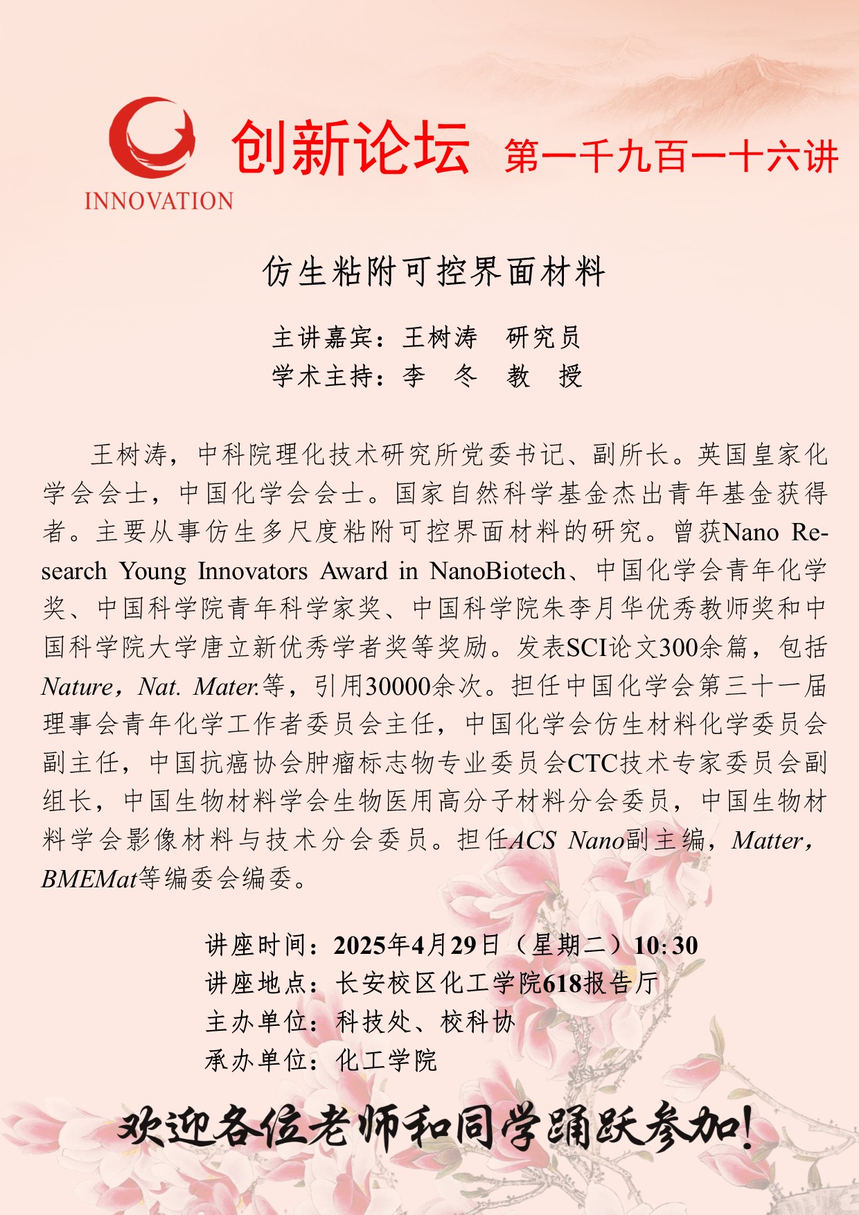 王树涛 研究员 乐动网页版登录入口创新论坛第一千九百一十六讲:仿生粘附可控界面材料 讲座时间 2025年4月29日(星期二)10:30 讲座地点 长安校区化工学院618报告厅 讲座人介绍 王树涛 研究员 讲座内容