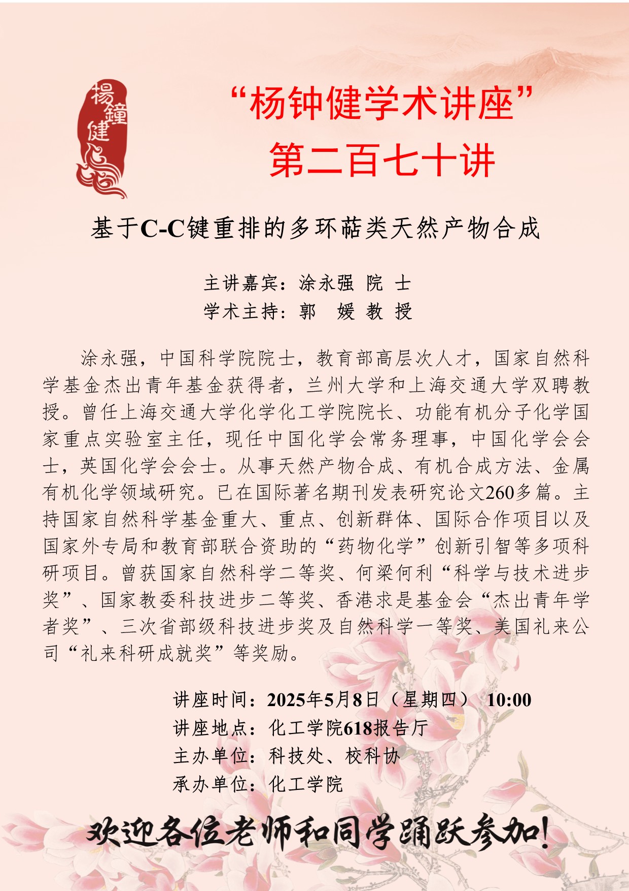 “杨钟健学术讲座” 第二百七十讲:基于C-C键重排的多环萜类天然产物合成
