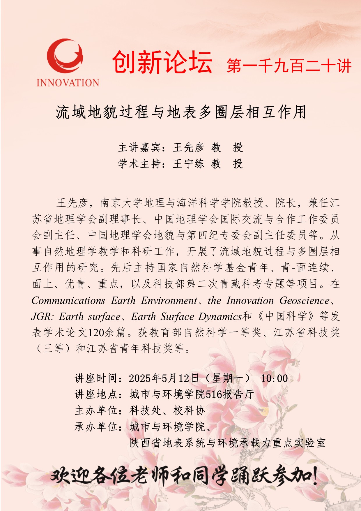 王先彦 教授 乐动网页版登录入口创新论坛第一千九百二十讲:流域地貌过程与地表多圈层相互作用 讲座时间 2025年5月12日(星期一) 10:00 讲座地点 城市与环境学院516报告厅 讲座人介绍 王先彦 教授 讲座内容