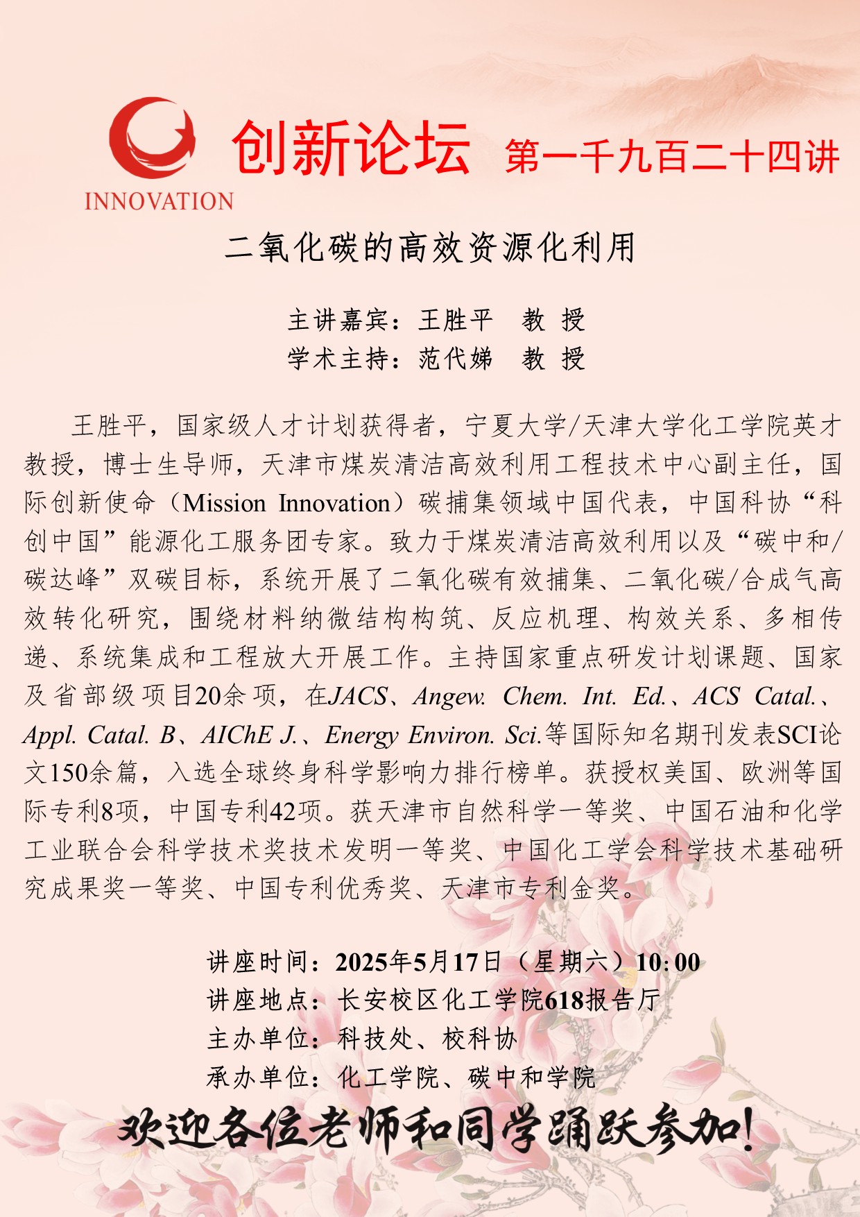 王胜平 教授 乐动网页版登录入口创新论坛第一千九百二十四讲:二氧化碳的高效资源化利用 讲座时间 2025年5月17日(星期六)10:00 讲座地点 长安校区化工学院618报告厅 讲座人介绍 王胜平 教授 讲座内容