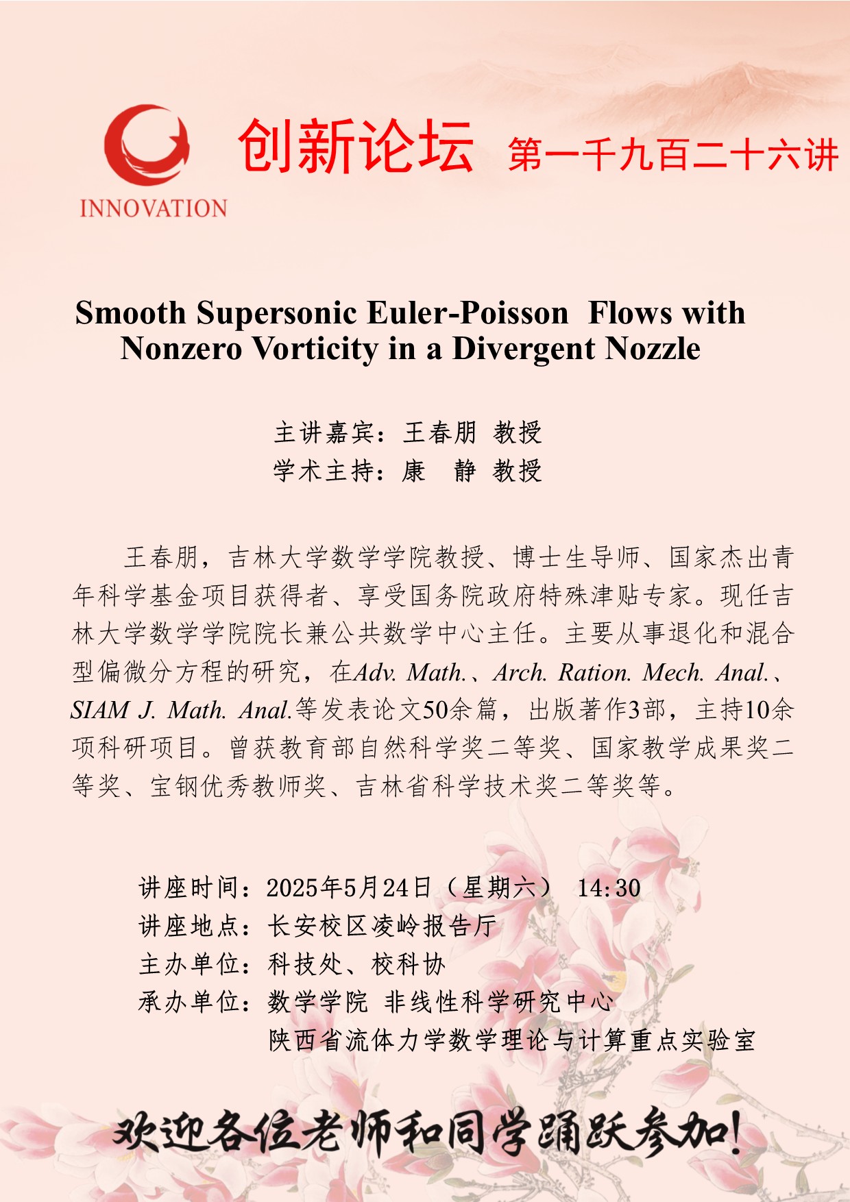 王春朋 教授 乐动网页版登录入口创新论坛第一千九百二十六讲:Smooth Supersonic Euler-Poisson Flows with Nonzero Vorticity in a Divergent Nozzle 讲座时间 2025年5月24日(星期六) 14:30 讲座地点 长安校区凌岭报告厅 讲座人介绍 王春朋 教授 讲座内容