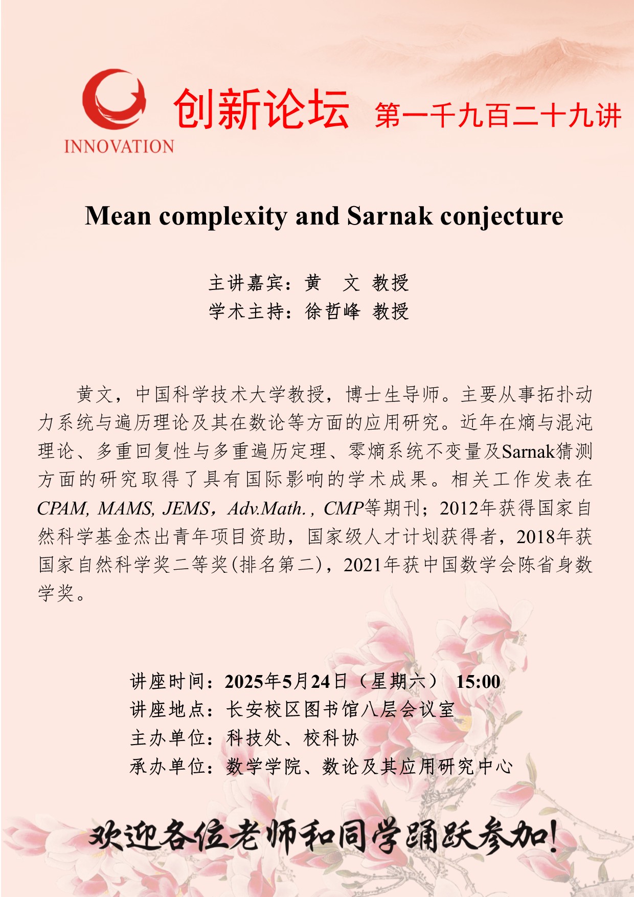 黄文 教授 乐动网页版登录入口创新论坛第一千九百二十九讲:Mean complexity and Sarnak conjecture 讲座时间 2025年5月24日(星期六) 15:00 讲座地点 长安校区图书馆八层会议室 讲座人介绍 黄文 教授 讲座内容