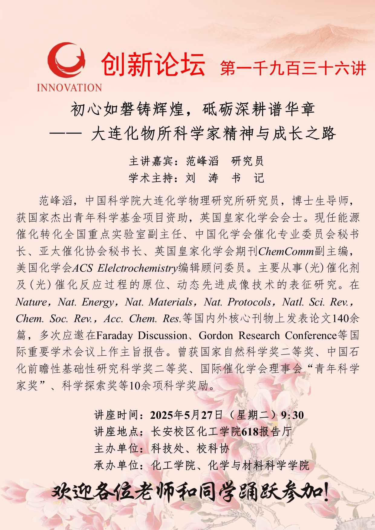 范峰滔 研究员 乐动网页版登录入口创新论坛第一千九百三十六讲:初心如磐铸辉煌,砥砺深耕谱华章——大连化物所科学家精神与成长之路 讲座时间 2025年5月27日(星期二)9:30 讲座地点 长安校区化工学院618报告厅 讲座人介绍 范峰滔 研究员 讲座内容