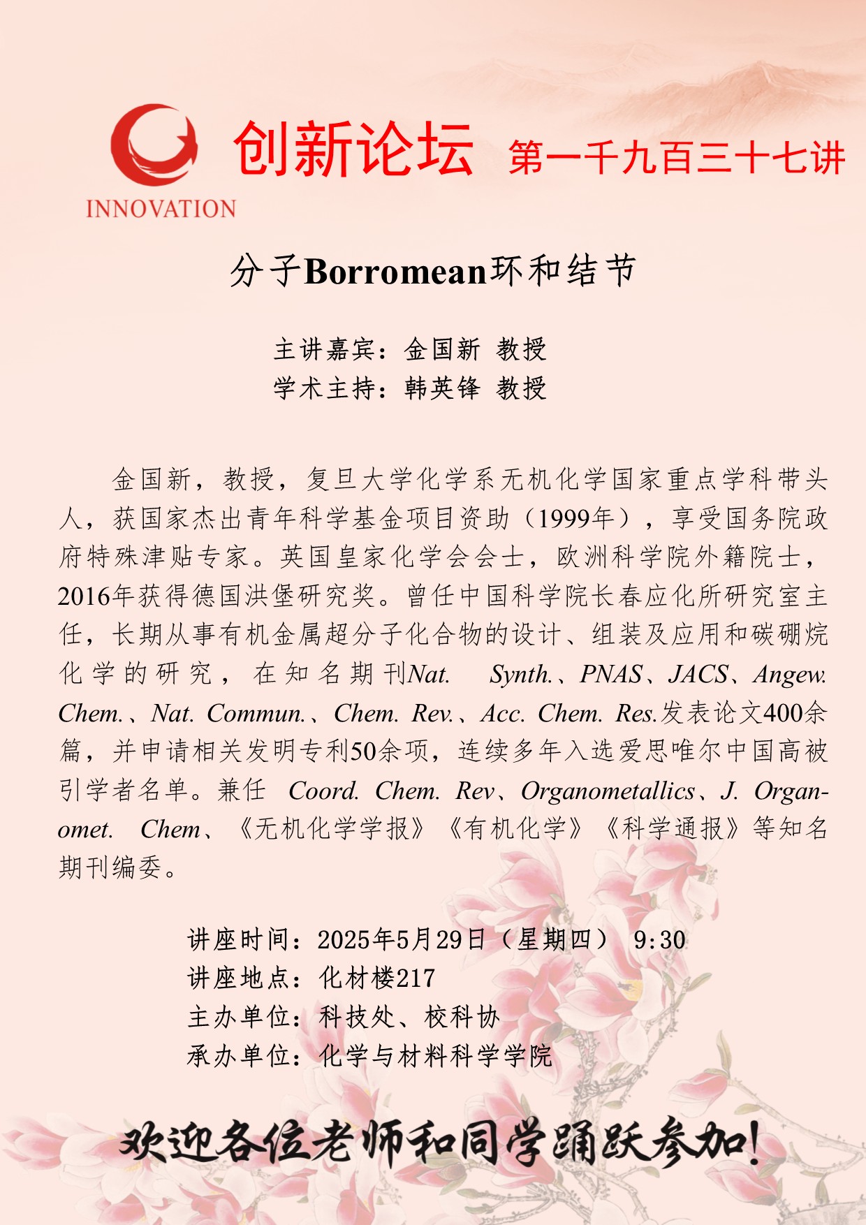 金国新 教授 乐动网页版登录入口创新论坛第一千九百三十七讲:分子Borromean环和结节 讲座时间 2025年5月29日(星期四) 9:30 讲座地点 化材楼217 讲座人介绍 金国新 教授 讲座内容