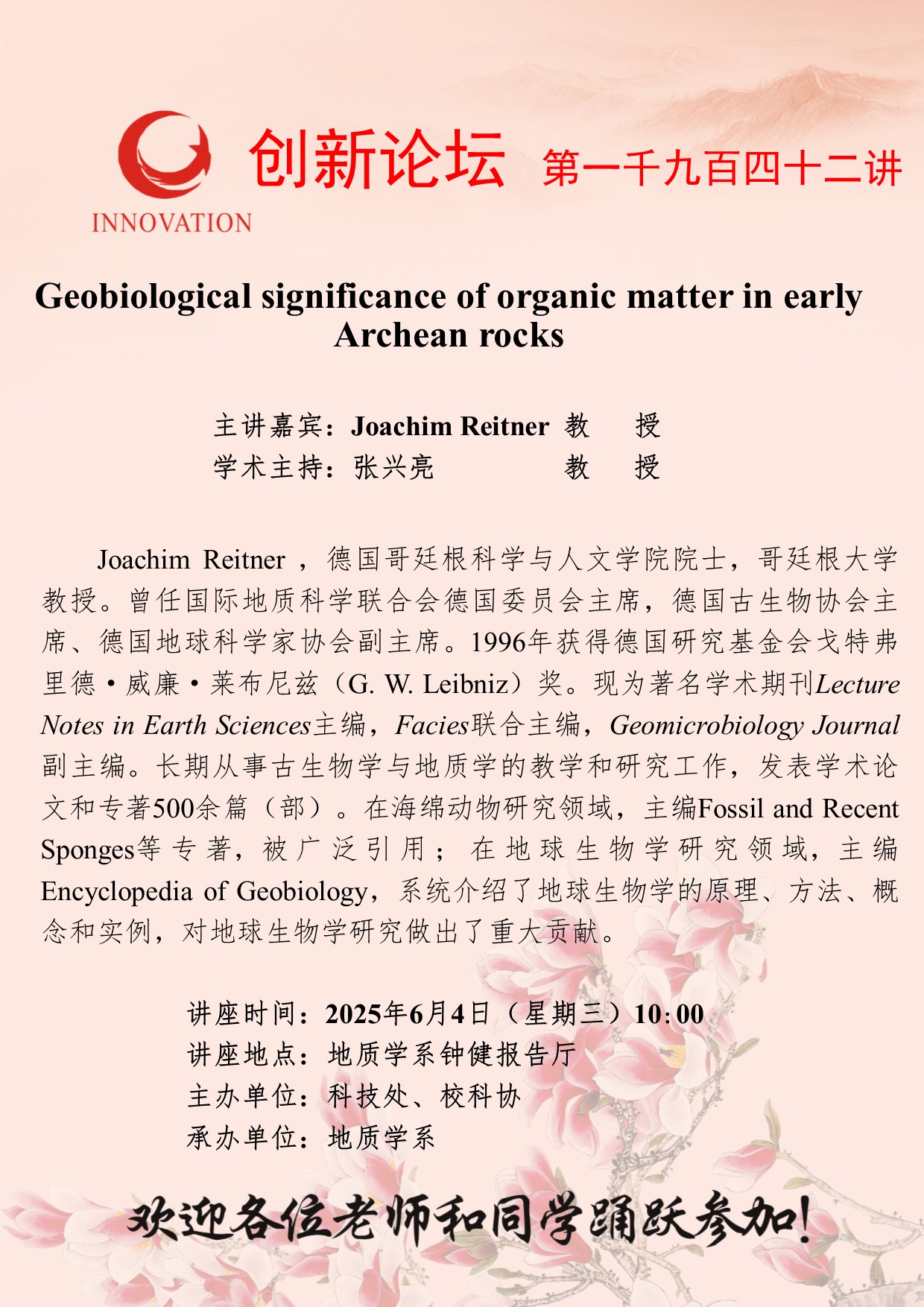 Joachim Reitner 教授 乐动网页版登录入口创新论坛第一千九百四十二讲:Geobiological significance of organic matter in early Archean rocks 讲座时间 2025年6月4日(星期三)10:00 讲座地点 地质学系钟健报告厅 讲座人介绍 Joachim Reitner 教授 讲座内容