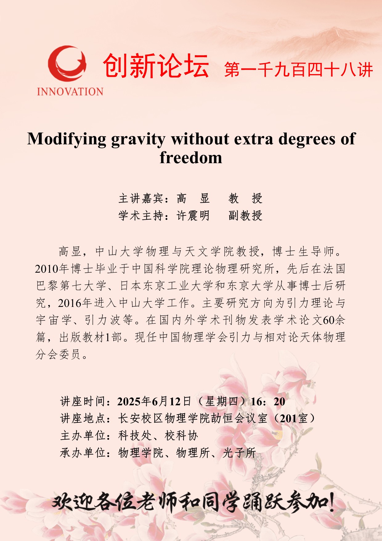 高显 教授 乐动网页版登录入口创新论坛第一千九百四十八讲:Modifying gravity without extra degrees of freedom 讲座时间 2025年6月12日(星期四)16:20 讲座地点 长安校区物理学院劼恒会议室(201室) 讲座人介绍 高显 教授 讲座内容