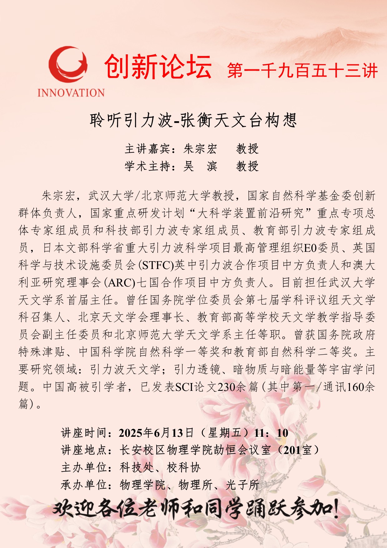 朱宗宏 教授 乐动网页版登录入口创新论坛第一千九百五十三讲:聆听引力波-张衡天文台构想 讲座时间 2025年6月13日(星期五)11:10 讲座地点 长安校区物理学院劼恒会议室(201室) 讲座人介绍 朱宗宏 教授 讲座内容