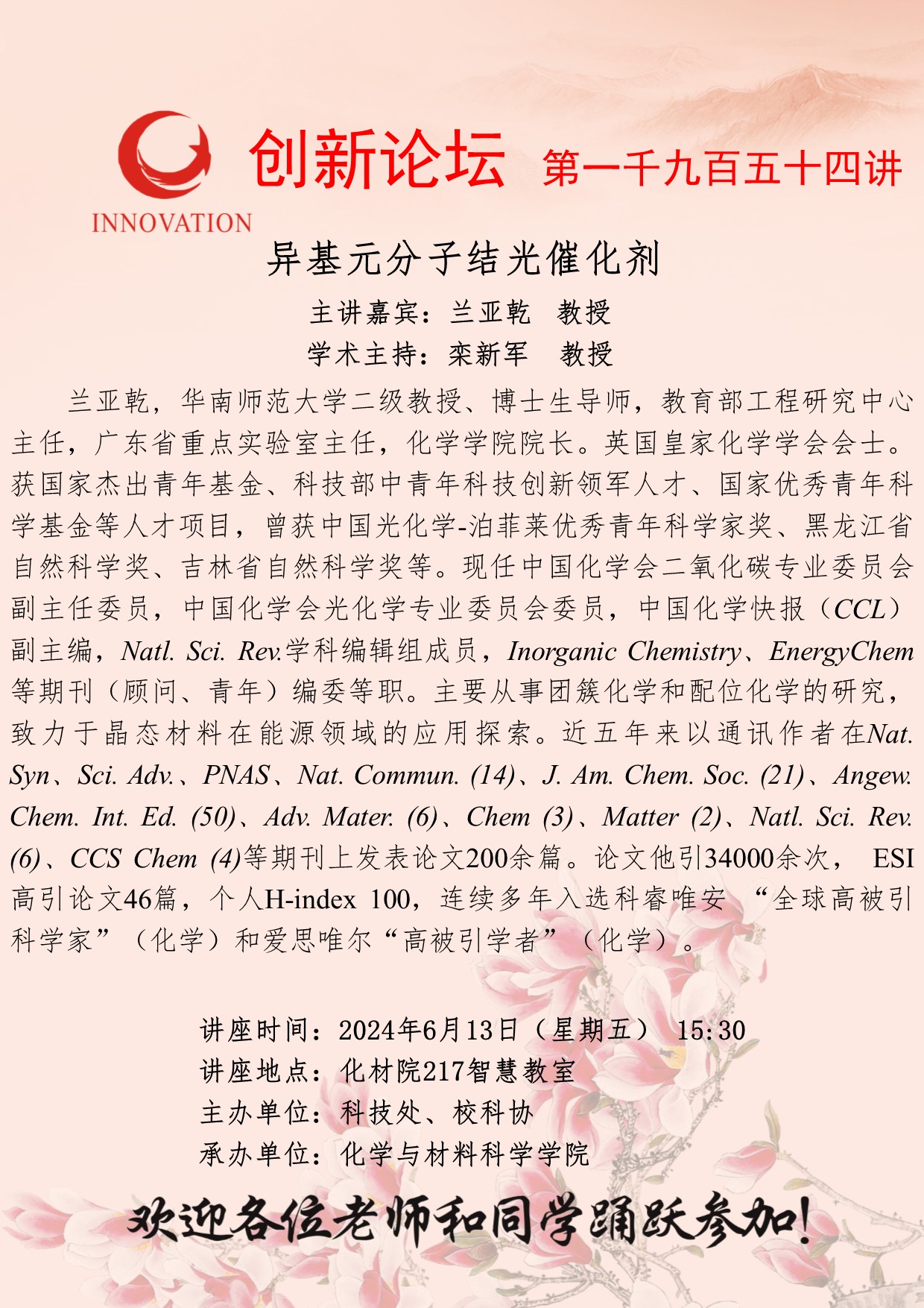 兰亚乾 教授 乐动网页版登录入口创新论坛第一千九百五十四讲:异基元分子结光催化剂 讲座时间 2024年6月13日(星期五) 15:30 讲座地点 化材院217智慧教室 讲座人介绍 兰亚乾 教授 讲座内容