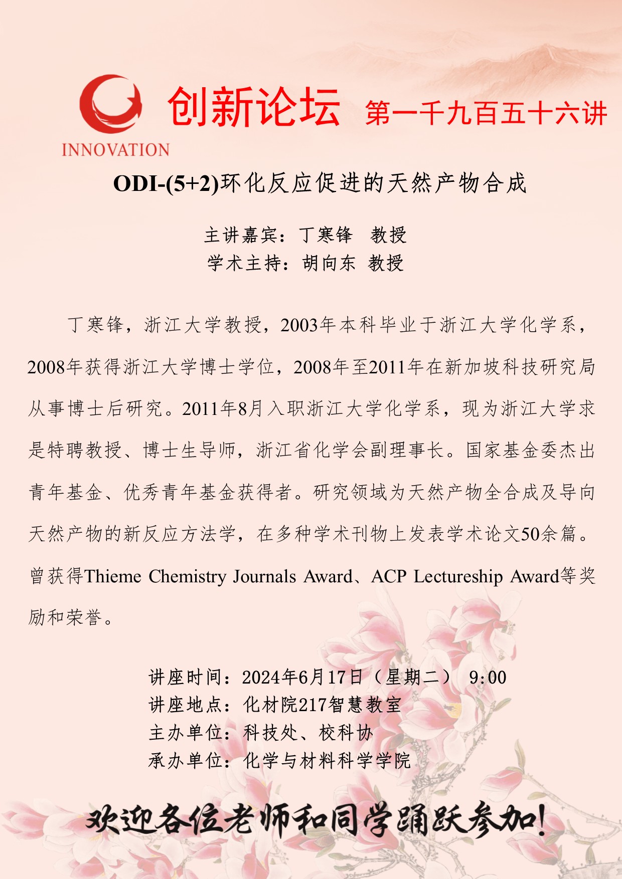 丁寒锋 教授 乐动网页版登录入口创新论坛第一千九百五十六讲:ODI-(5+2)环化反应促进的天然产物合成 讲座时间 2024年6月17日(星期二) 9:00 讲座地点 化材院217智慧教室 讲座人介绍 丁寒锋 教授 讲座内容