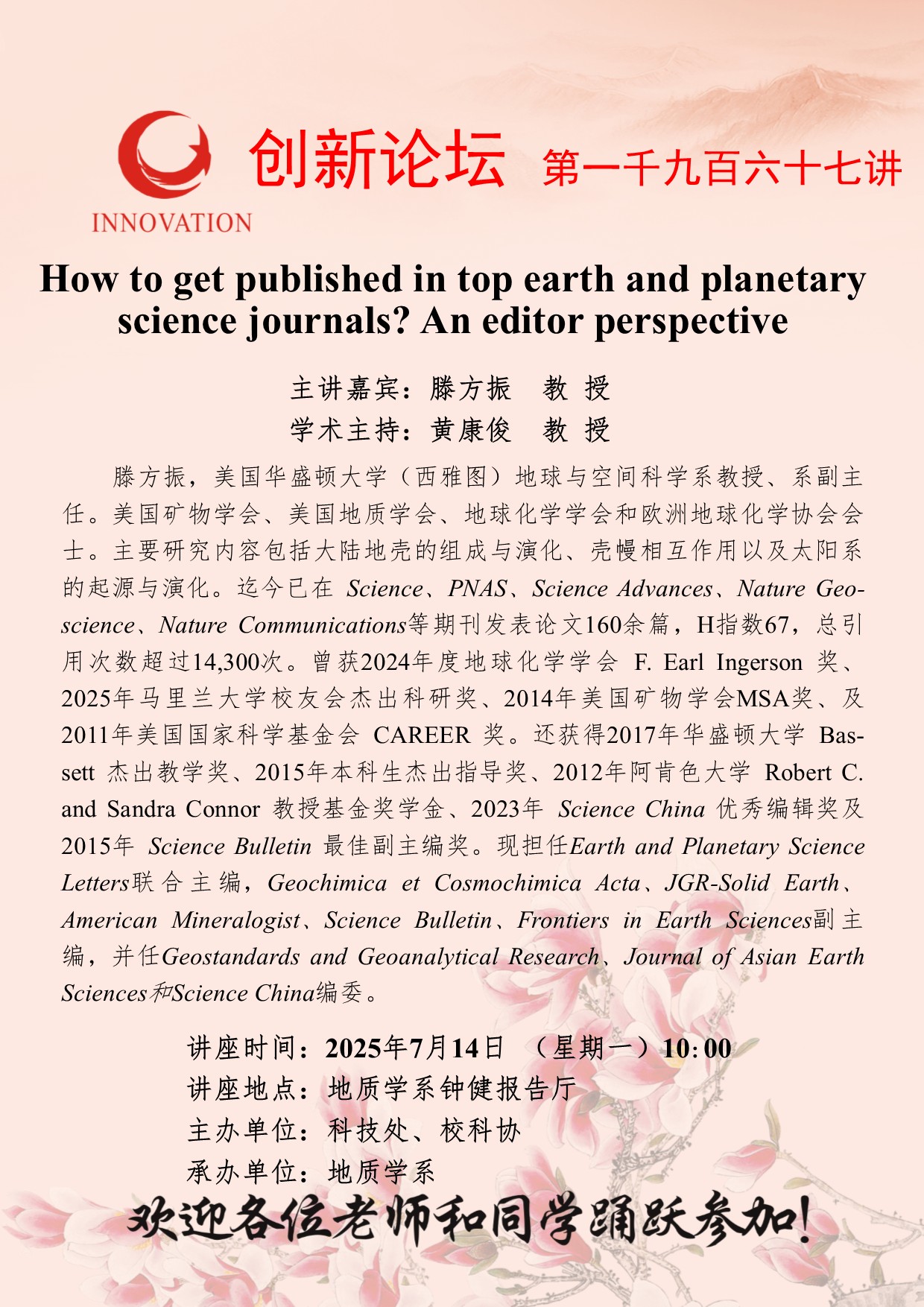 滕方振 教授 乐动网页版登录入口创新论坛第一千九百六十七讲:How to get published in top earth and planetary science journals? An editor perspective 讲座时间 2025年7月14日 (星期一)10:00 讲座地点 地质学系钟健报告厅 讲座人介绍 滕方振 教授 讲座内容