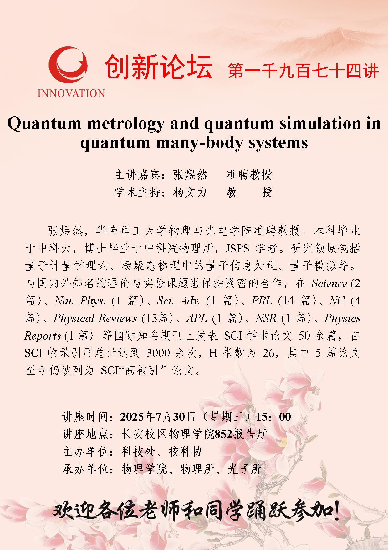 张煜然 准聘教授 乐动网页版登录入口创新论坛第一千九百七十四讲:Quantum metrology and quantum simulation in quantum many-body systems 讲座时间 2025年7月30日(星期三)15:00 讲座地点 长安校区物理学院852报告厅 讲座人介绍 张煜然 准聘教授 讲座内容