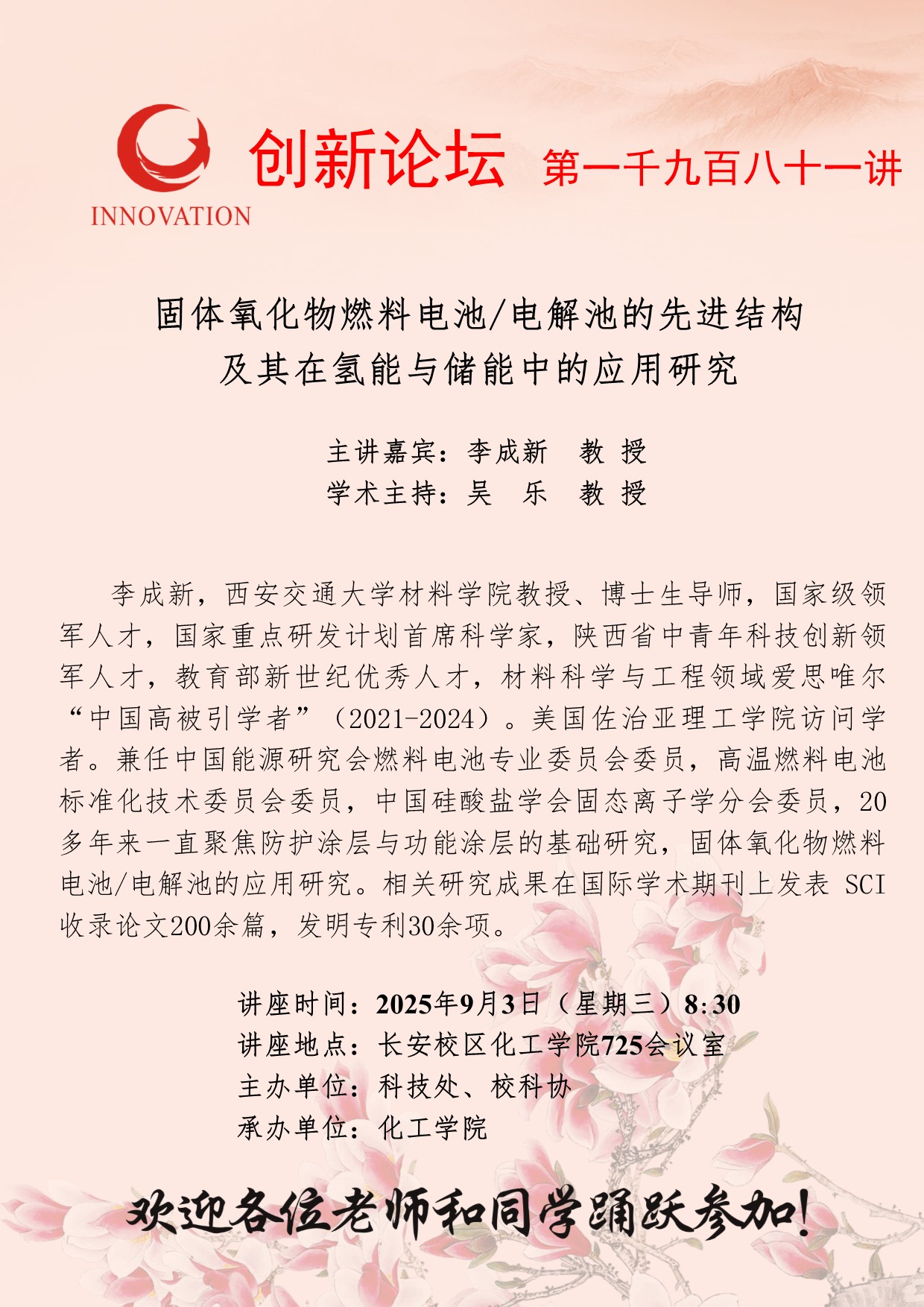 李成新 教授 乐动网页版登录入口创新论坛第一千九百八十一讲:固体氧化物燃料电池/电解池的先进结构及其在氢能与储能中的应用研究 讲座时间 2025年9月3日(星期三)8:30 讲座地点 长安校区化工学院725会议室 讲座人介绍 李成新 教授 讲座内容