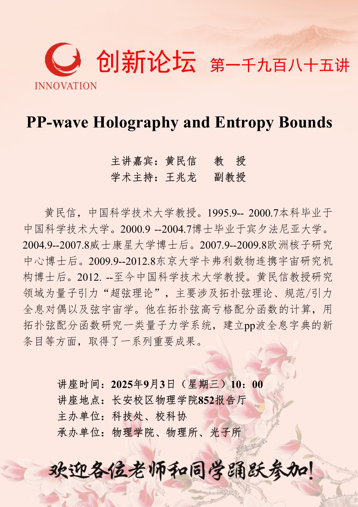 黄民信 教授 乐动网页版登录入口创新论坛第一千九百八十五讲:PP-wave Holography and Entropy Bounds 讲座时间 2025年9月3日(星期三)10:00 讲座地点 长安校区物理学院852报告厅 讲座人介绍 黄民信 教授 讲座内容