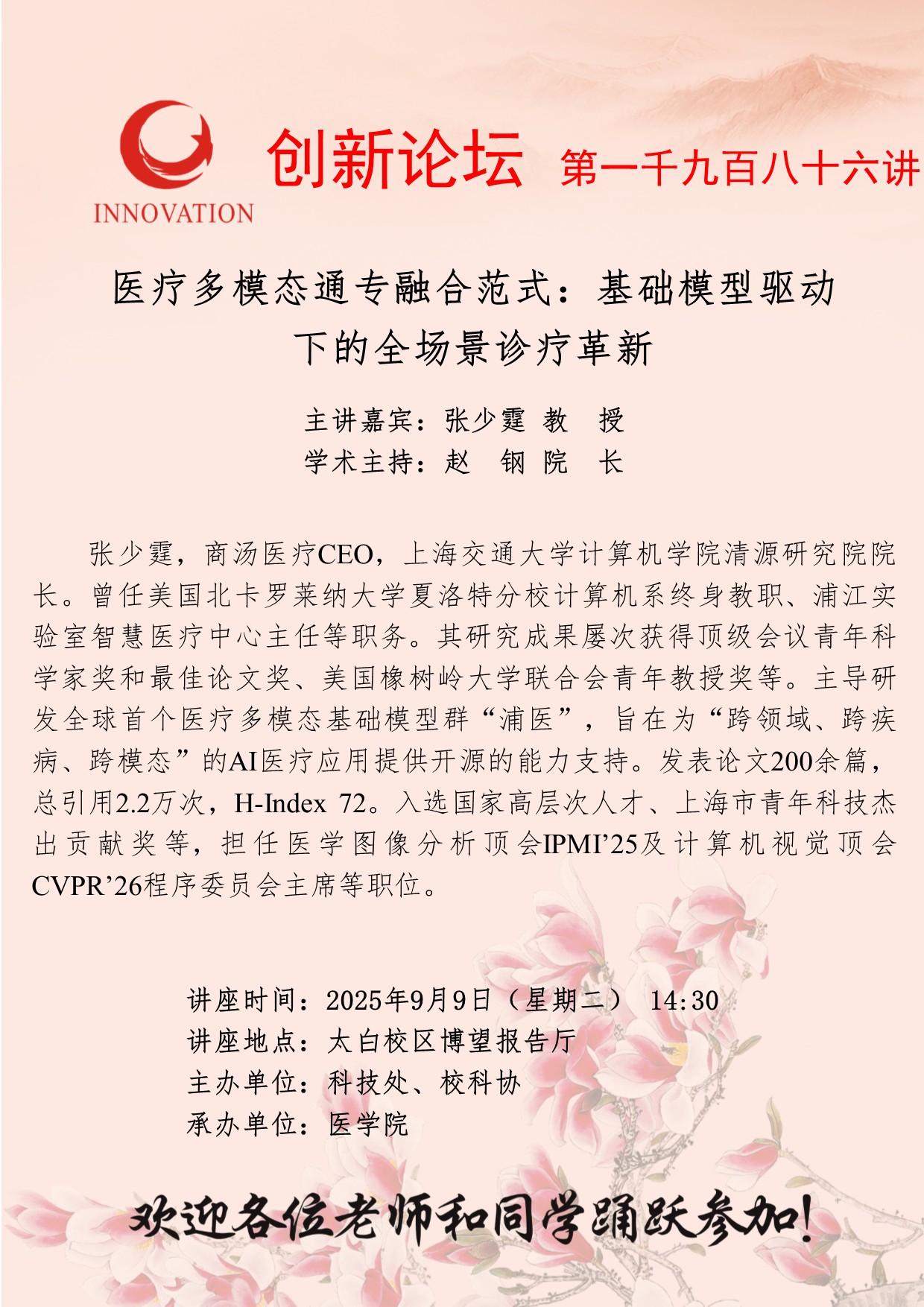 张少霆 教 授 乐动网页版登录入口创新论坛第一千九百八十六讲:医疗多模态通专融合范式:基础模型驱动下的全场景诊疗革新 讲座时间 2025年9月9日(星期二) 14:30 讲座地点 太白校区博望报告厅 讲座人介绍 张少霆 教 授 讲座内容 fu