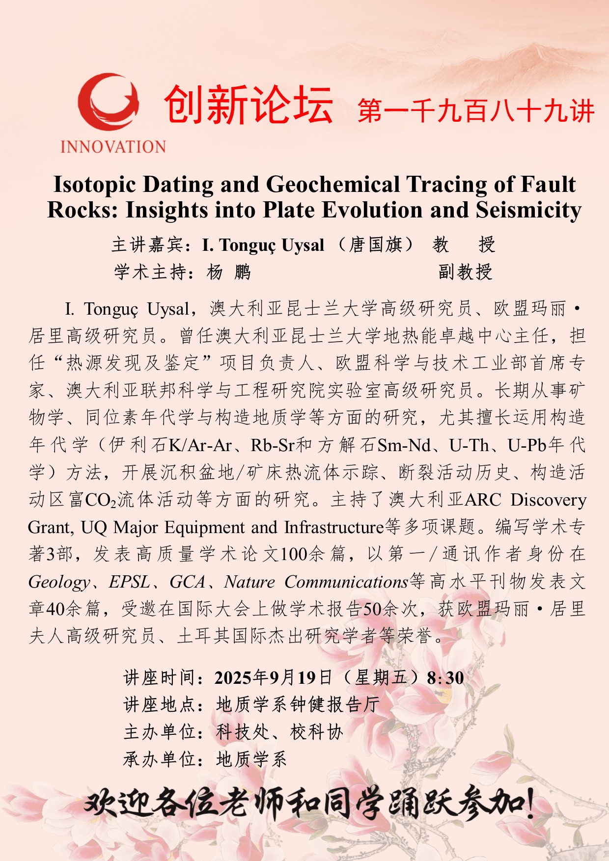 I. Tonguç Uysal 教授 乐动网页版登录入口创新论坛第一千九百八十九讲:Isotopic Dating and Geochemical Tracing of Fault Rocks: Insights into Plate Evolution and Seismicity 讲座时间 2025年9月19日(星期五)8:30 讲座地点 地质学系钟健报告厅 讲座人介绍 I. Tonguç Uysal 教授 讲座内容