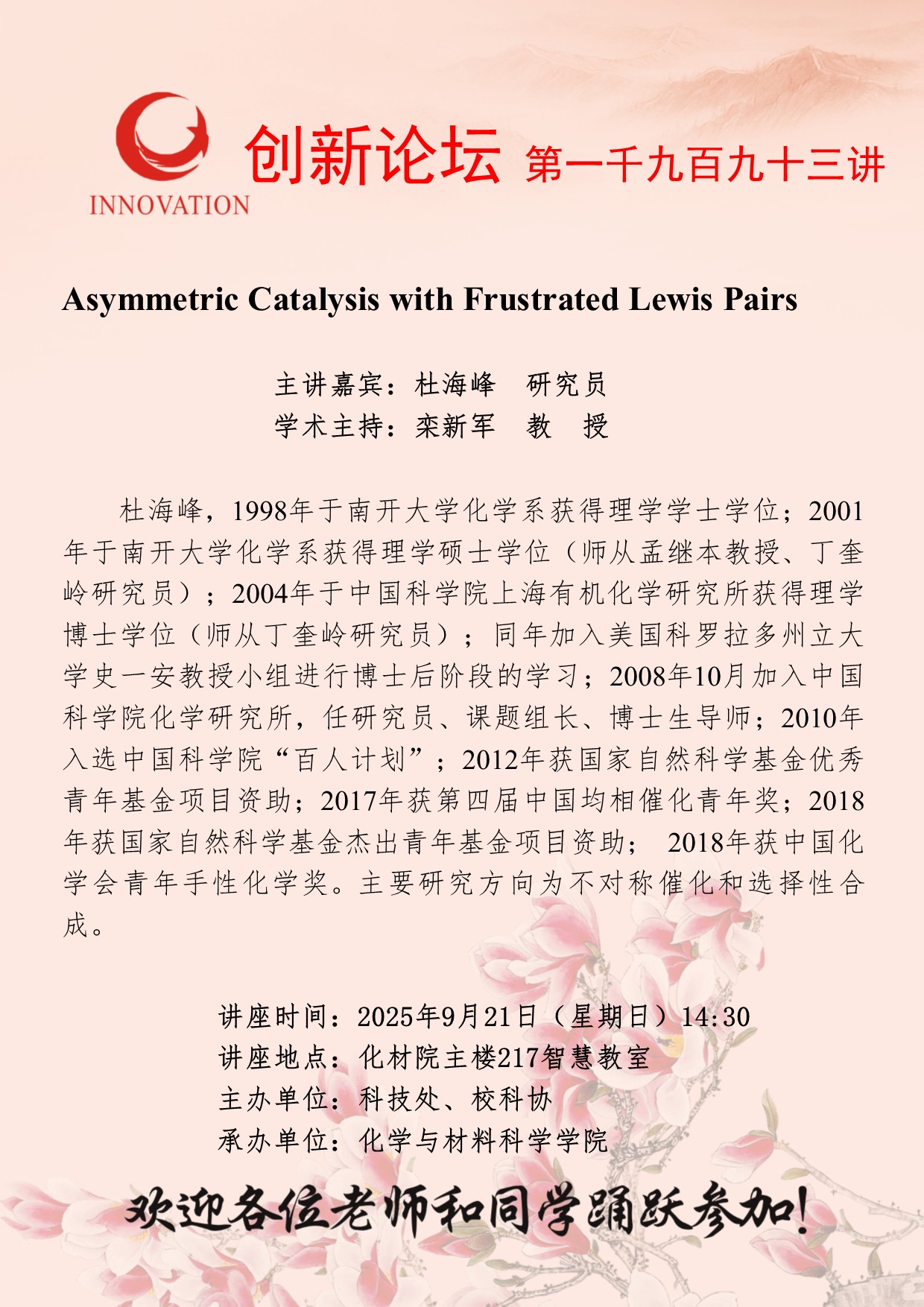 杜海峰 研究员 乐动网页版登录入口创新论坛第一千九百九十三讲:Asymmetric Catalysis with Frustrated Lewis Pairs 讲座时间 2025年9月21日(星期日)14:30 讲座地点 化材院主楼217智慧教室 讲座人介绍 杜海峰 研究员 讲座内容