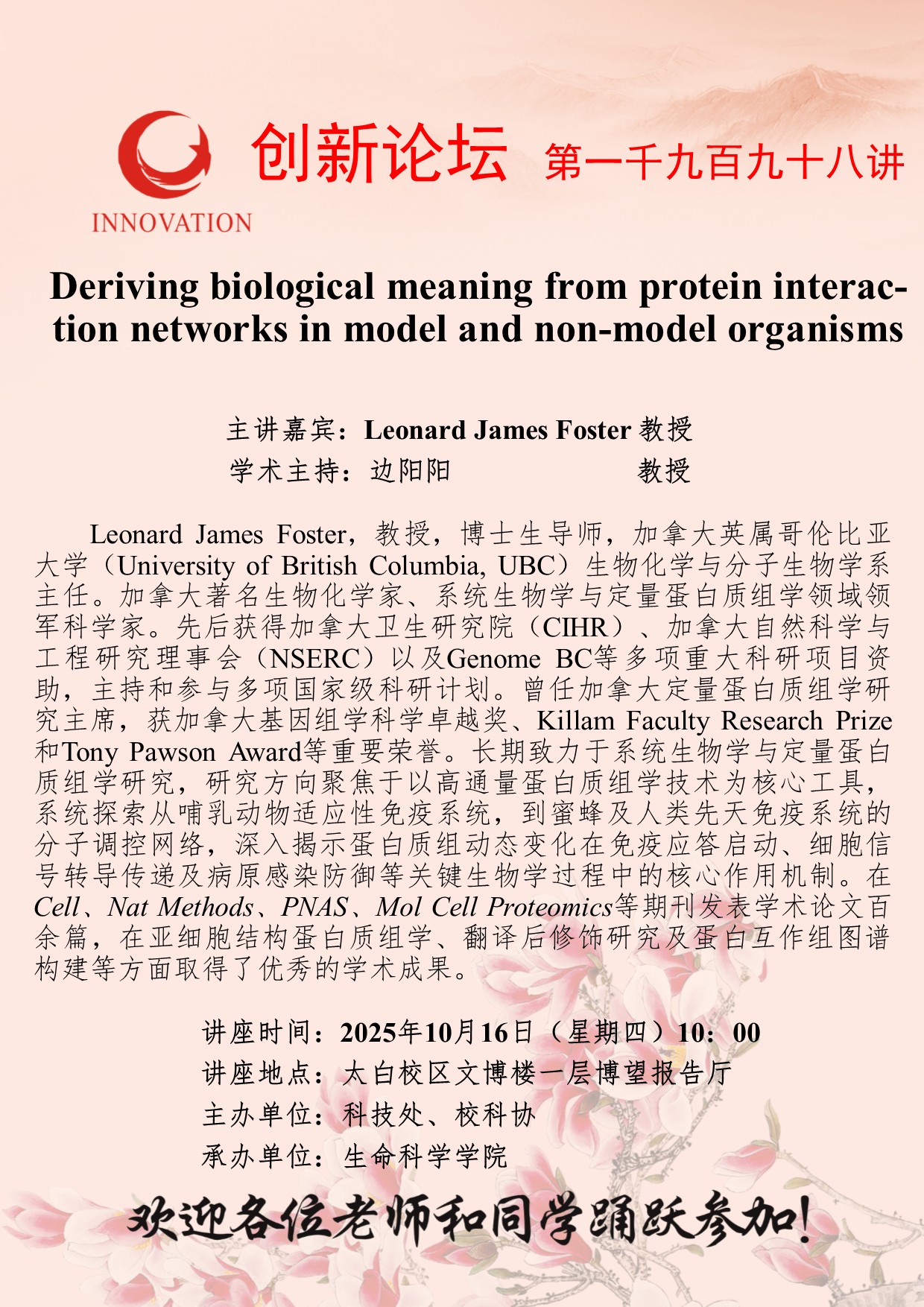 Leonard James Foster 教授 乐动网页版登录入口创新论坛第一千九百九十八讲:Deriving biological meaning from protein interaction networks in model and non-model organisms 讲座时间 2025年10月16日(星期四)10:00 讲座地点 太白校区文博楼一层博望报告厅 讲座人介绍 Leonard James Foster 教授 讲座内容