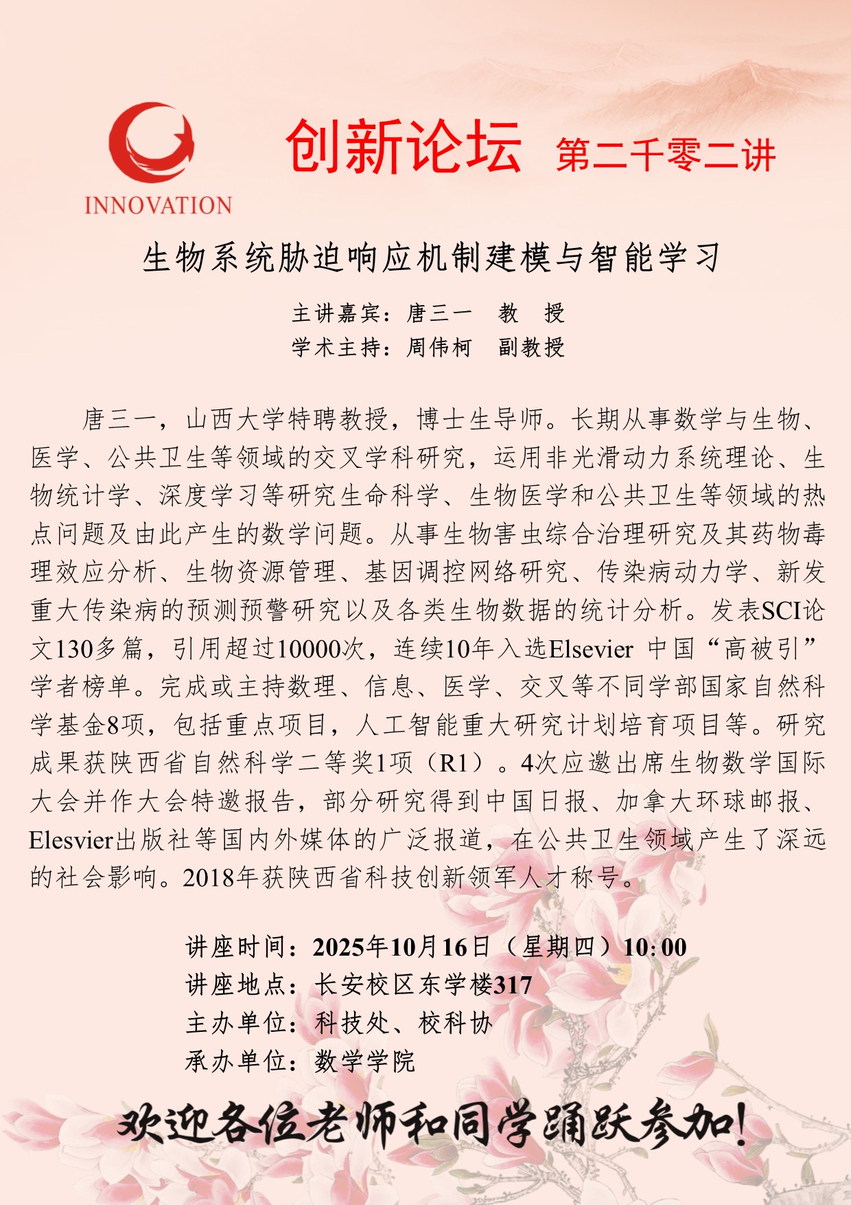 唐三一 教授 乐动网页版登录入口创新论坛第二千零二讲:生物系统胁迫响应机制建模与智能学习 讲座时间 2025年10月16日(星期四)10:00 讲座地点 长安校区东学楼317 讲座人介绍 唐三一 教授 讲座内容