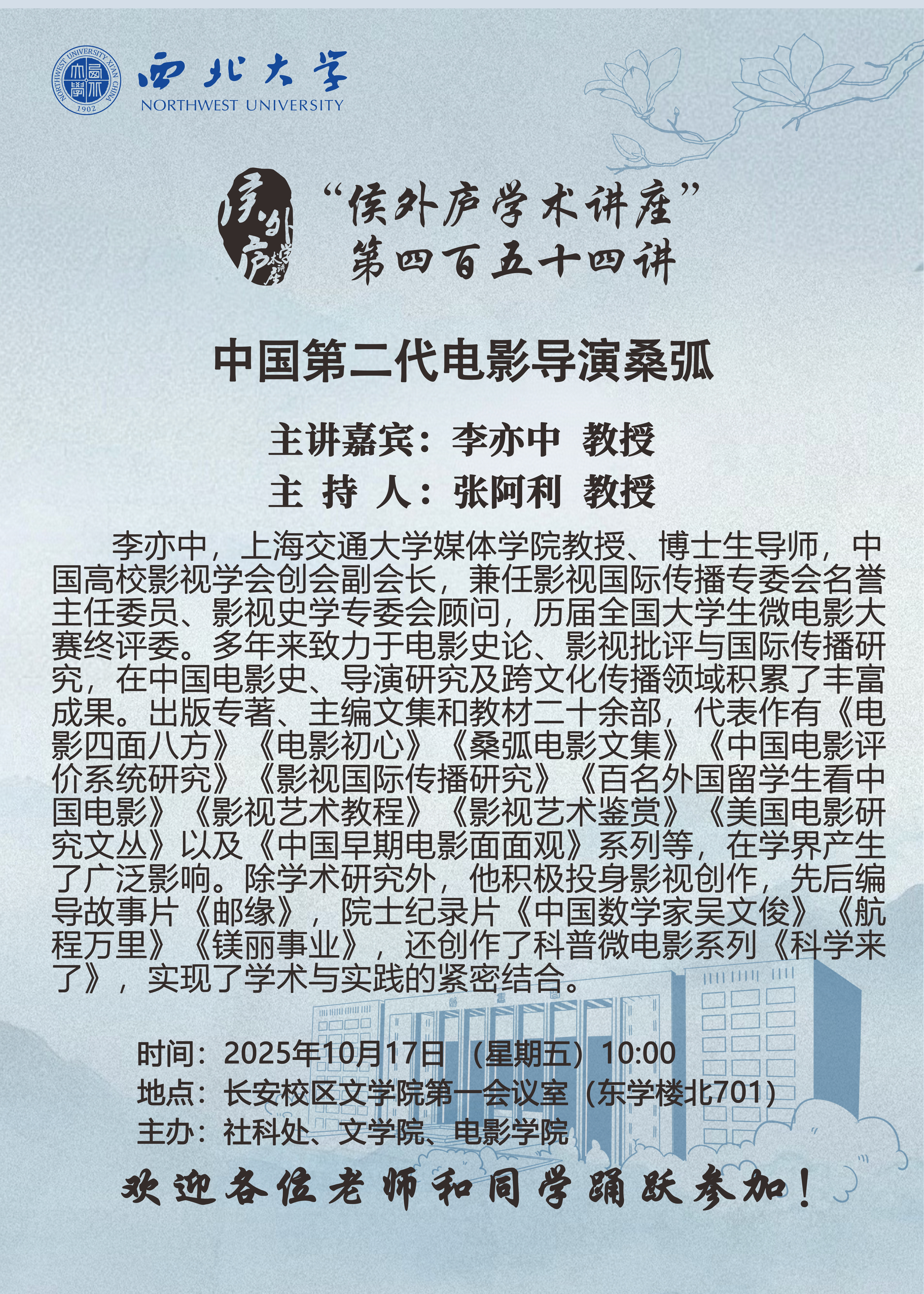 李亦中 教授 “侯外庐学术讲座”第四百五十四讲:中国第二代电影导演桑弧 讲座时间 2025年10月17日(星期五)10:00 讲座地点 长安校区文学院第一会议室(东学楼北701) 讲座人介绍 李亦中 教授 讲座内容