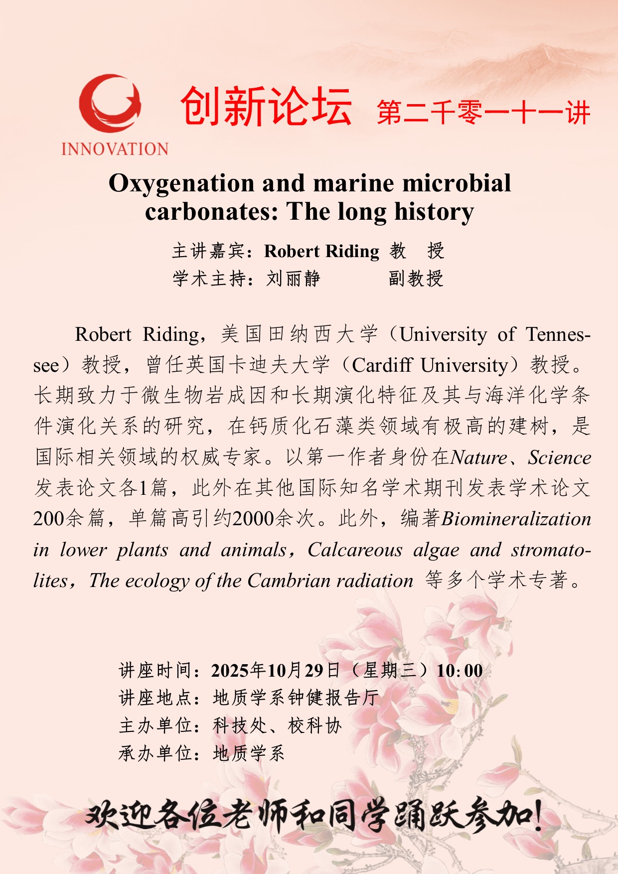 Robert Riding 教授 乐动网页版登录入口创新论坛第二千零一十一讲:Oxygenation and marine microbial carbonates: The long history 讲座时间 2025年10月29日(星期三)10:00 讲座地点 地质学系钟健报告厅 讲座人介绍 Robert Riding 教授 讲座内容