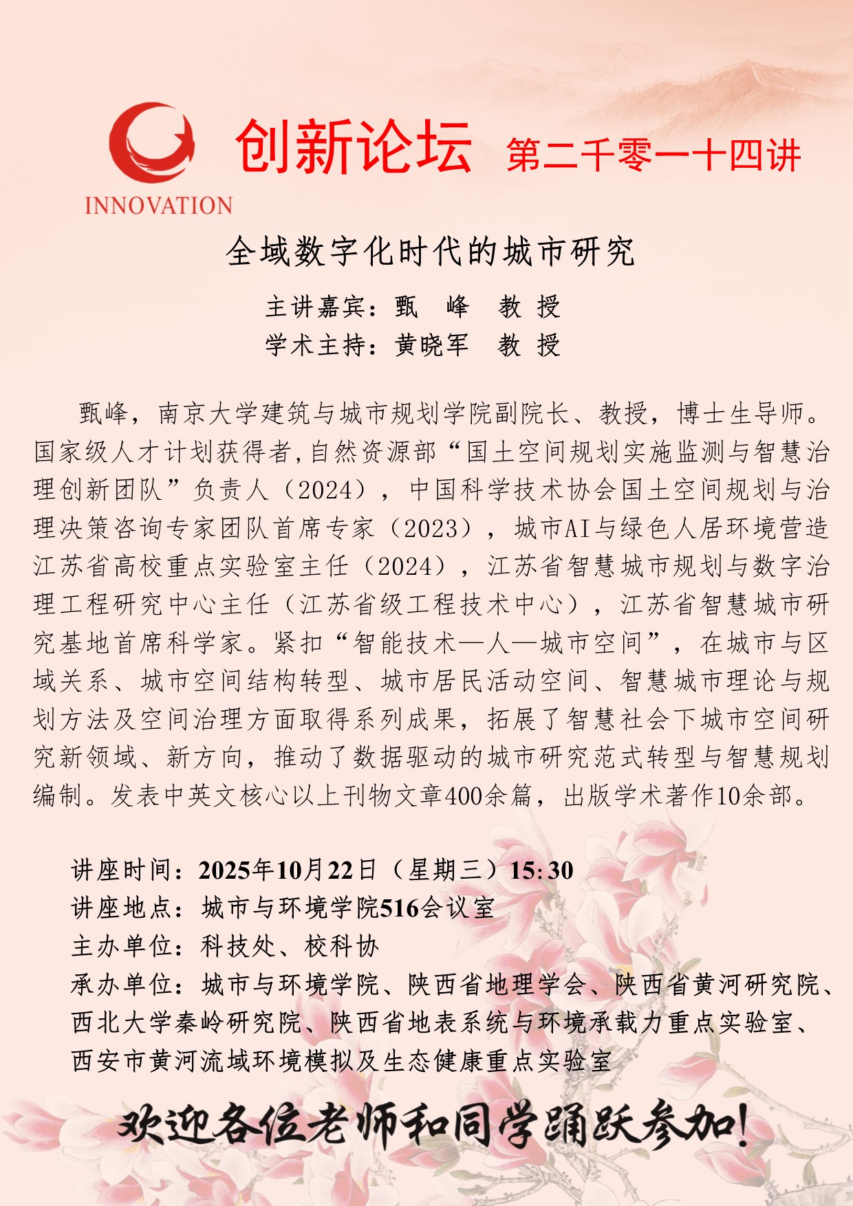 甄峰 教授 乐动网页版登录入口创新论坛第二千零一十四讲:全域数字化时代的城市研究 讲座时间 2025年10月22日(星期三)15:30 讲座地点 城市与环境学院516会议室 讲座人介绍 甄峰 教授 讲座内容