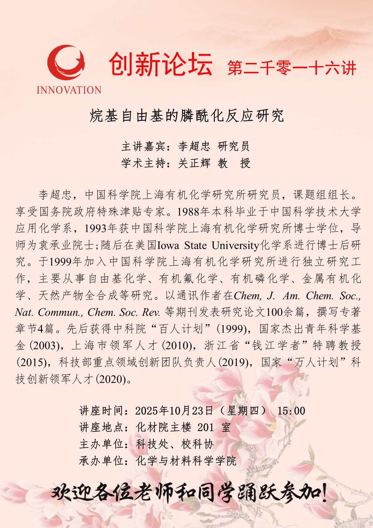 李超忠 研究员 乐动网页版登录入口创新论坛第二千零一十六讲:烷基自由基的膦酰化反应研究 讲座时间 2025年10月23日(星期四) 15:00 讲座地点 化材院主楼 201 室 讲座人介绍 李超忠 研究员 讲座内容