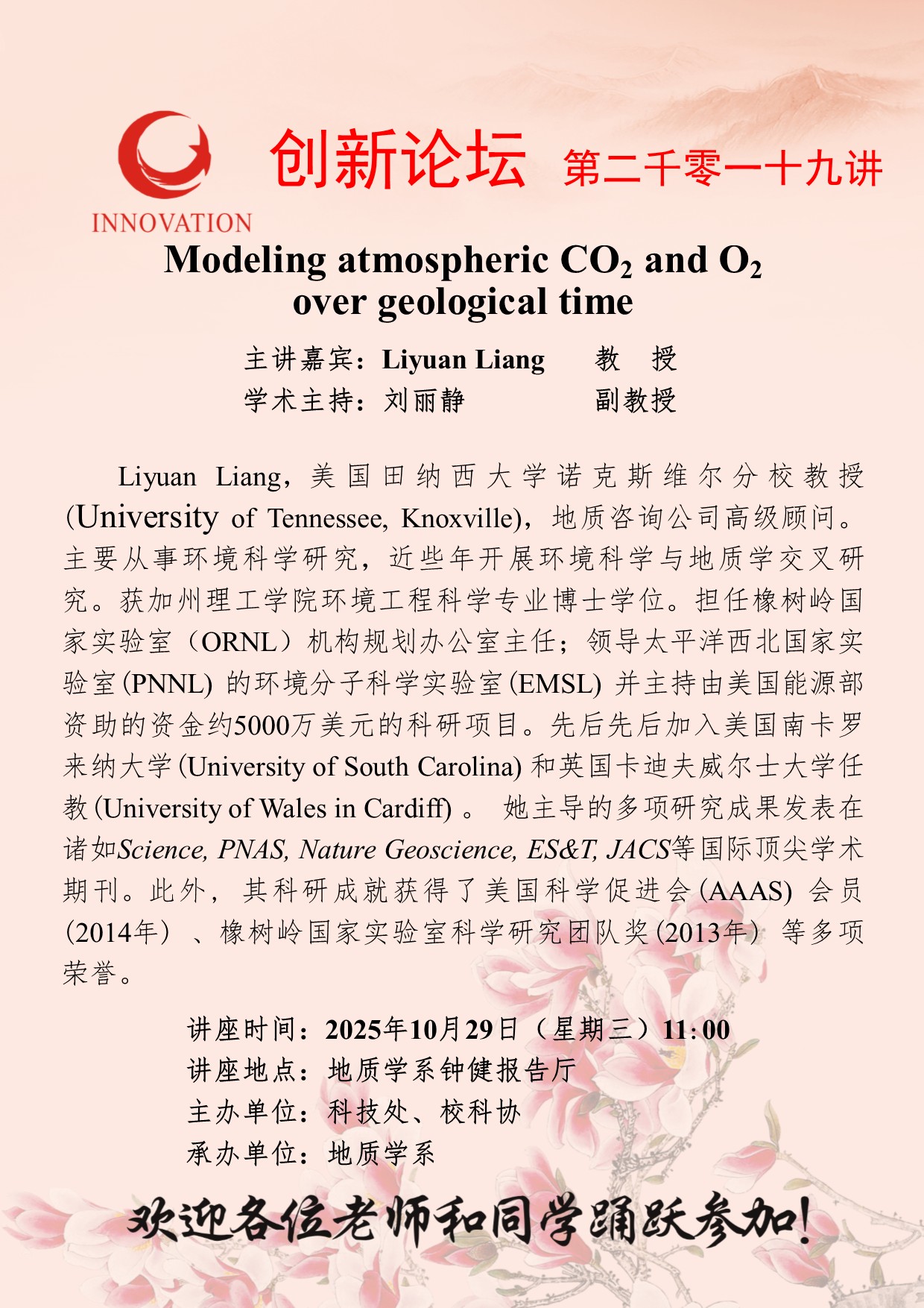 Liyuan Liang 教授 乐动网页版登录入口创新论坛第二千零一十九讲:Oxygenation and marine microbial carbonates: The long history 讲座时间 2025年10月29日(星期三)11:00 讲座地点 地质学系钟健报告厅 讲座人介绍 Liyuan Liang 教授 讲座内容