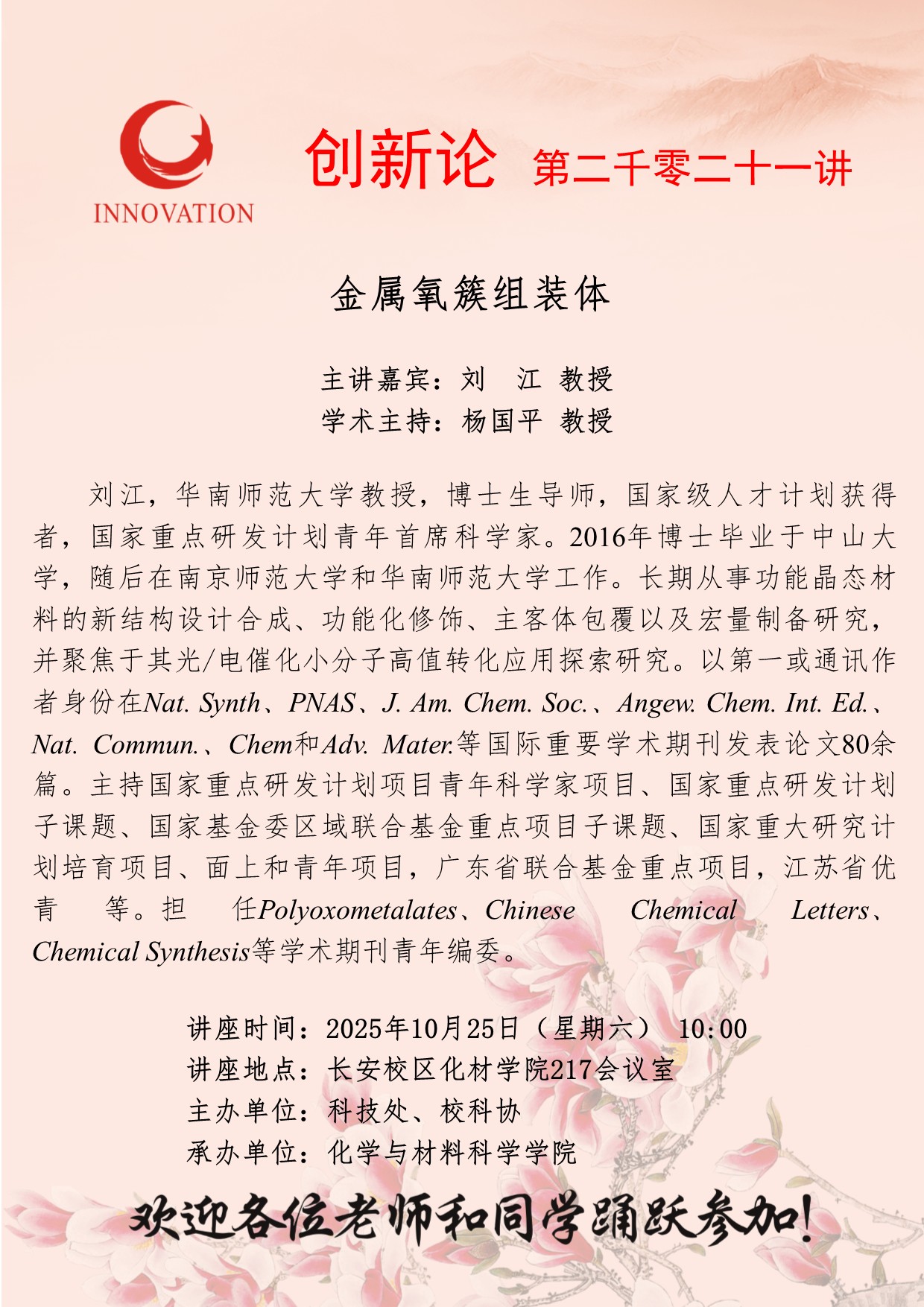 刘 江 教授 乐动网页版登录入口创新论坛第二千零二十一讲:金属氧簇组装体 讲座时间 2025年10月25日(星期六) 10:00 讲座地点 长安校区化材学院217会议室 讲座人介绍 刘 江 教授 讲座内容