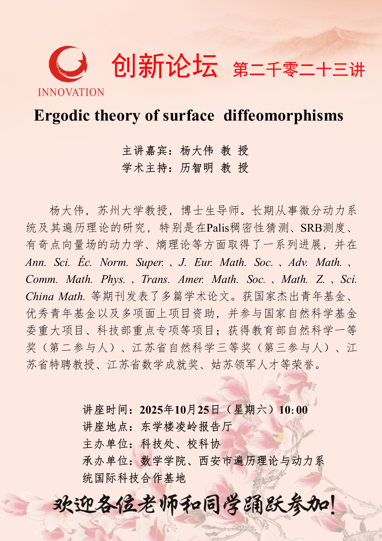 杨大伟 教 授 乐动网页版登录入口创新论坛第二千零二十三讲:Ergodic theory of surface diffeomorphisms 讲座时间 2025年10月25日(星期六)10:00 讲座地点 东学楼凌岭报告厅 讲座人介绍 杨大伟 教 授 讲座内容