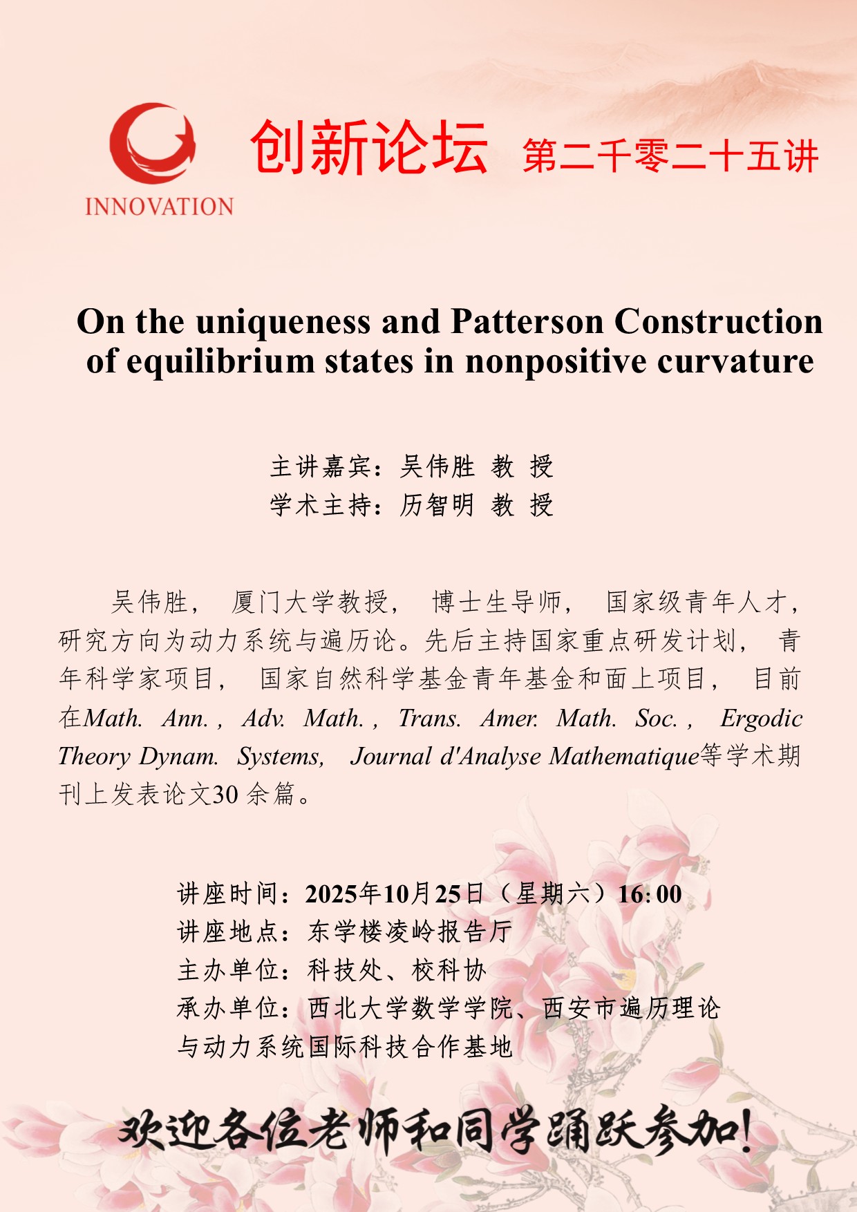 吴伟胜 教 授 乐动网页版登录入口创新论坛第二千零二十五讲:On the uniqueness and Patterson Construction of equilibrium states in nonpositive curvature 讲座时间 2025年10月25日(星期六)16:00 讲座地点 东学楼凌岭报告厅 讲座人介绍 吴伟胜 教 授 讲座内容