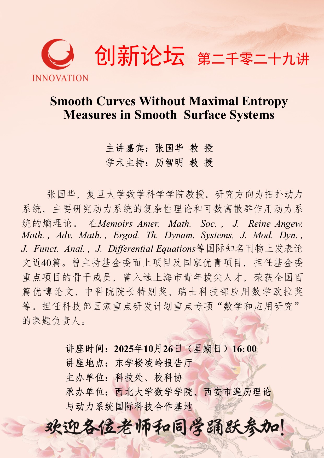 张国华 教 授 乐动网页版登录入口创新论坛第二千零二十九讲:Smooth Curves Without Maximal Entropy Measures in Smooth Surface Systems 讲座时间 2025年10月26日(星期日)16:00 讲座地点 东学楼凌岭报告厅 讲座人介绍 张国华 教 授 讲座内容