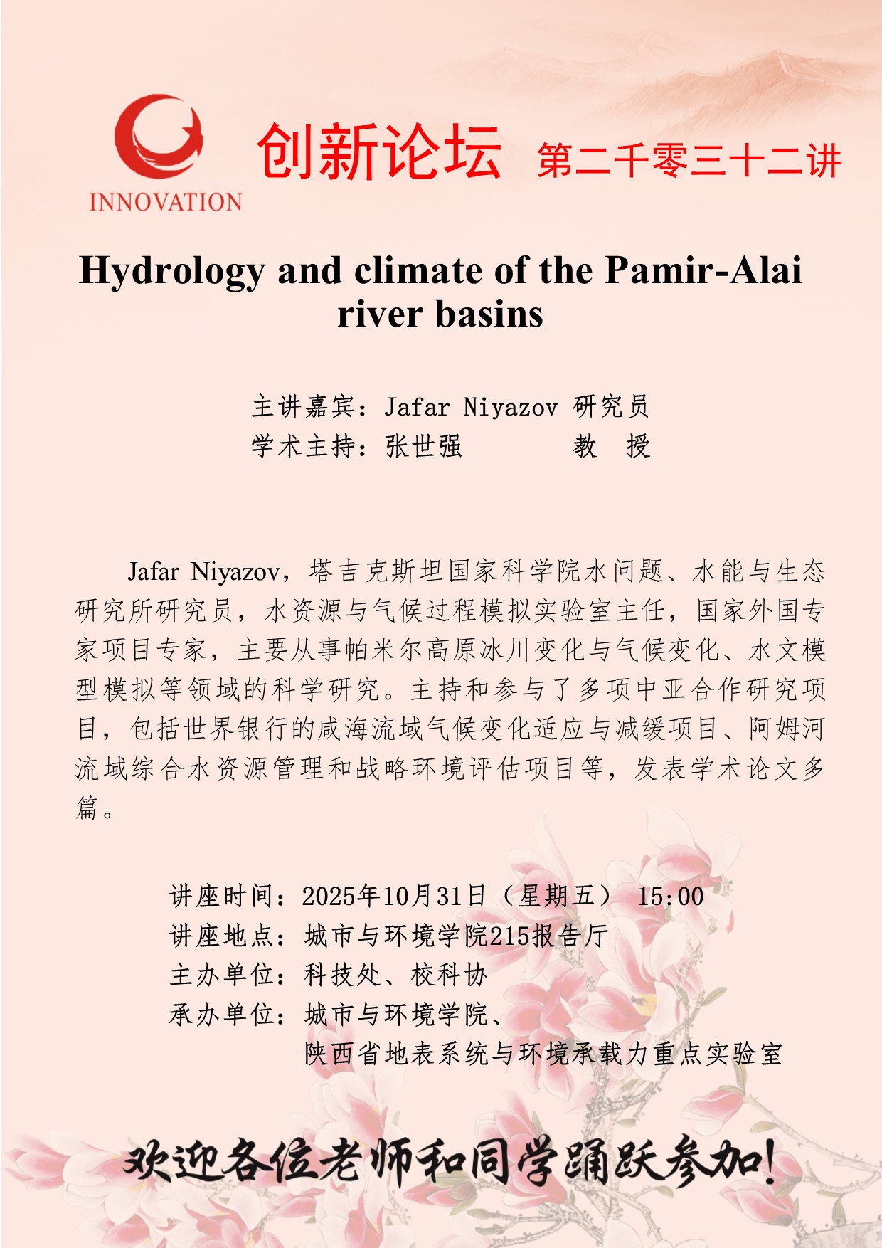 Jafar Niyazov 研究员 乐动网页版登录入口创新论坛第二千零三十二讲:Hydrology and climate of the Pamir-Alai river basins 讲座时间 2025年10月31日(星期五) 15:00 讲座地点 城市与环境学院215报告厅 讲座人介绍 Jafar Niyazov 研究员 讲座内容