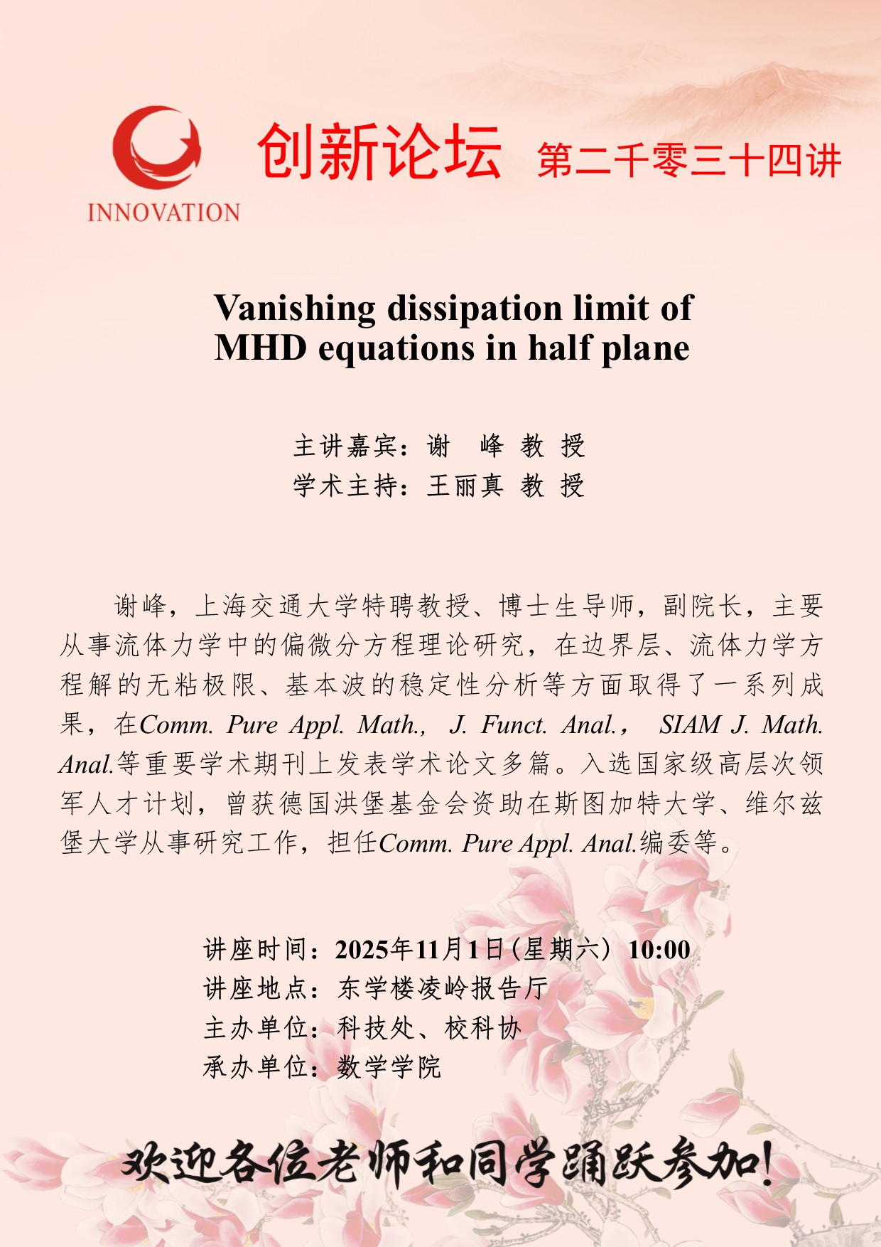 谢 峰 教 授 乐动网页版登录入口创新论坛第二千零三十四讲:Vanishing dissipation limit of MHD equations in half plane 讲座时间 2025年11月1日(星期六) 10:00 讲座地点 东学楼凌岭报告厅 讲座人介绍 谢 峰 教 授 讲座内容