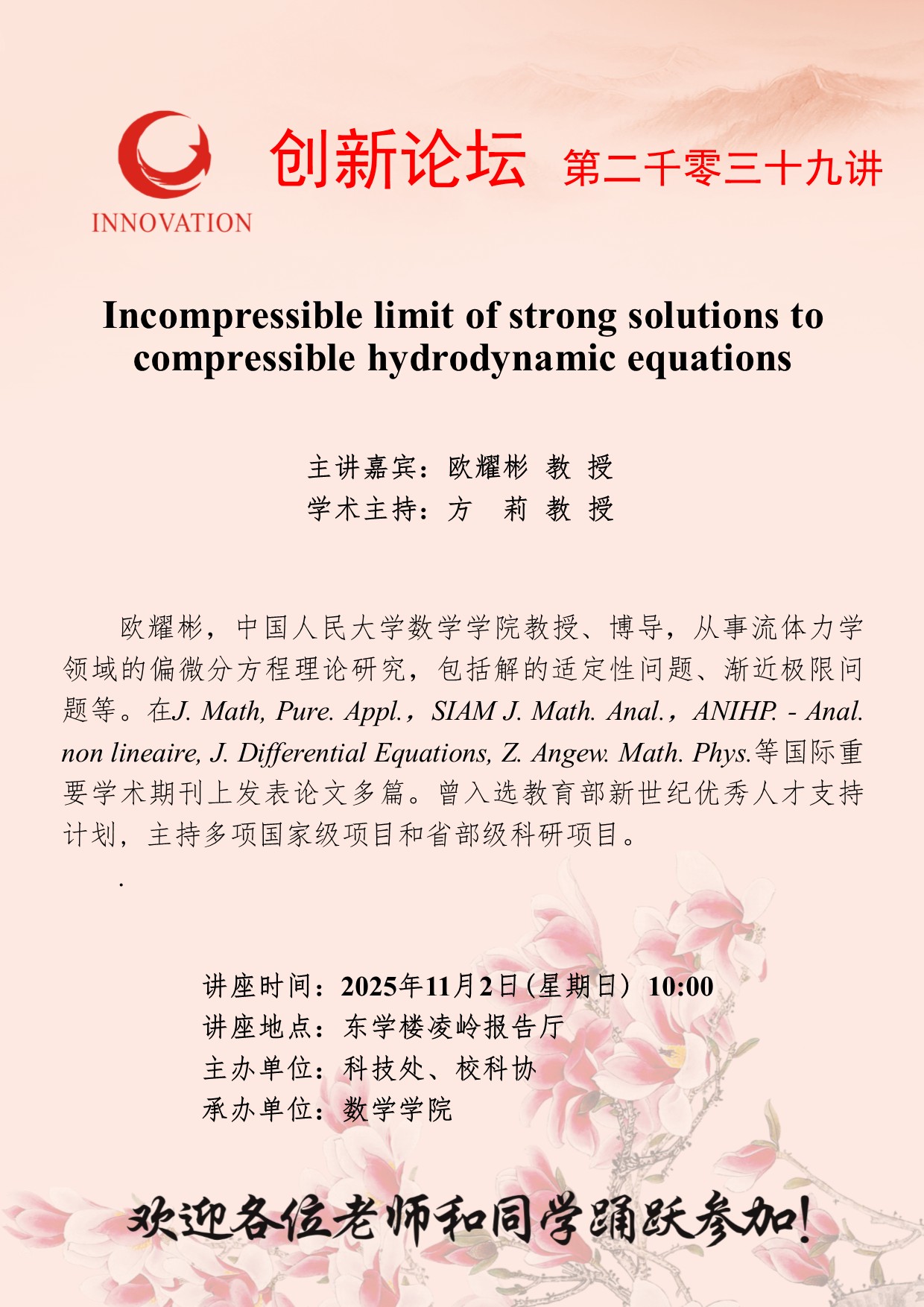 欧耀彬 教 授 乐动网页版登录入口创新论坛第二千零三十九讲:Incompressible limit of strong solutions to compressible hydrodynamic equations 讲座时间 2025年11月2日(星期日) 10:00 讲座地点 东学楼凌岭报告厅 讲座人介绍 欧耀彬 教 授 讲座内容