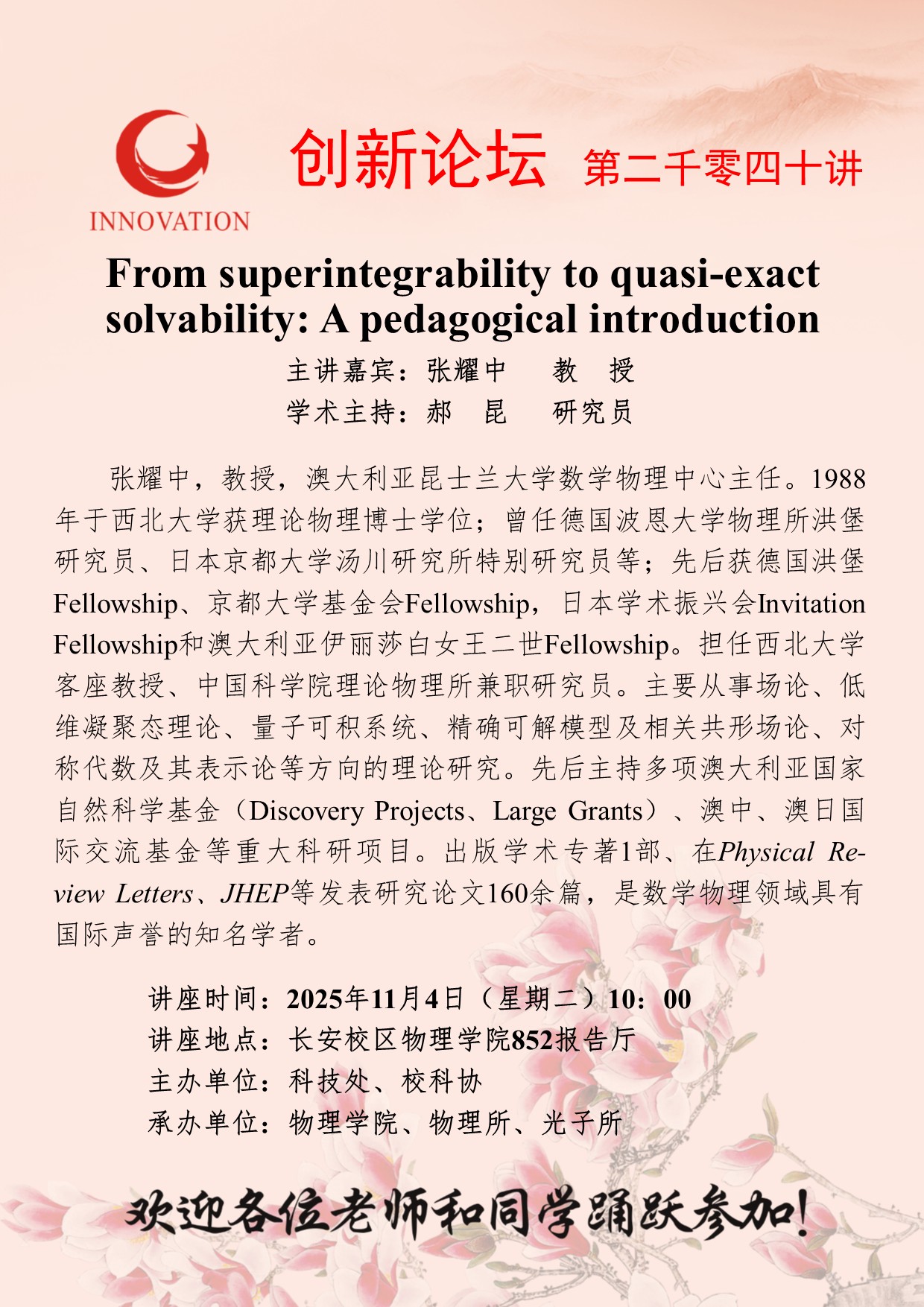 张耀中 教授 乐动网页版登录入口创新论坛第二千零四十讲:From superintegrability to quasi-exact solvability: A pedagogical introduction 讲座时间 2025年11月4日(星期二)10:00 讲座地点 长安校区物理学院852报告厅 讲座人介绍 张耀中 教授 讲座内容
