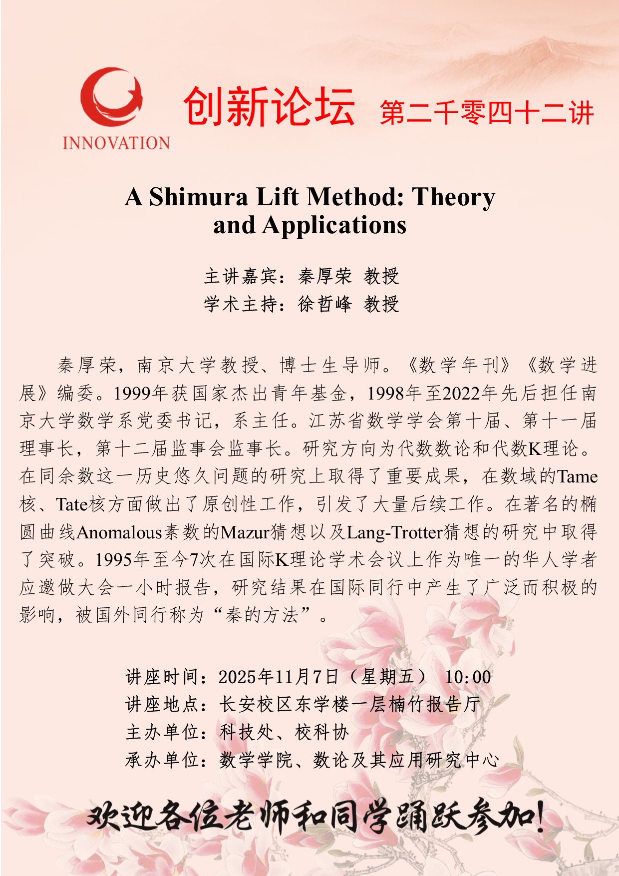 秦厚荣 教授 乐动网页版登录入口创新论坛第二千零四十二讲:A Shimura Lift Method: Theory and Applications 讲座时间 2025年11月7日(星期五) 10:00 讲座地点 长安校区东学楼一层楠竹报告厅 讲座人介绍 秦厚荣 教授 讲座内容