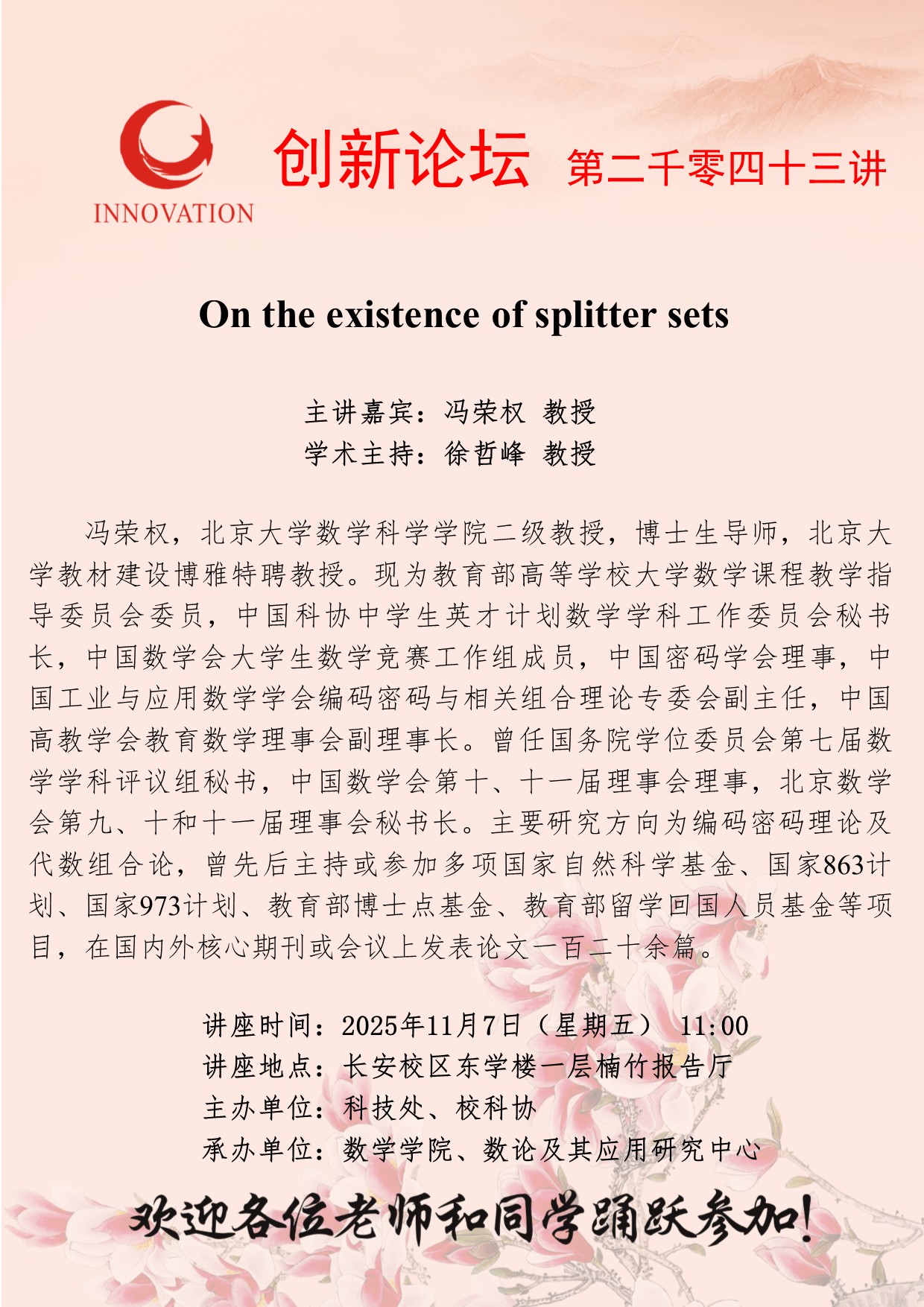 冯荣权 教授 乐动网页版登录入口创新论坛第二千零四十三讲:On the existence of splitter sets 讲座时间 2025年11月7日(星期五) 11:00 讲座地点 长安校区东学楼一层楠竹报告厅 讲座人介绍 冯荣权 教授 讲座内容