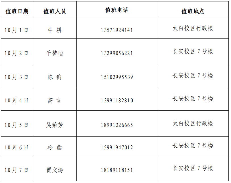按照学校相关工作要求,现将实验室建设与管理处2022年国庆节期间值班安排及联系方式安排如下: