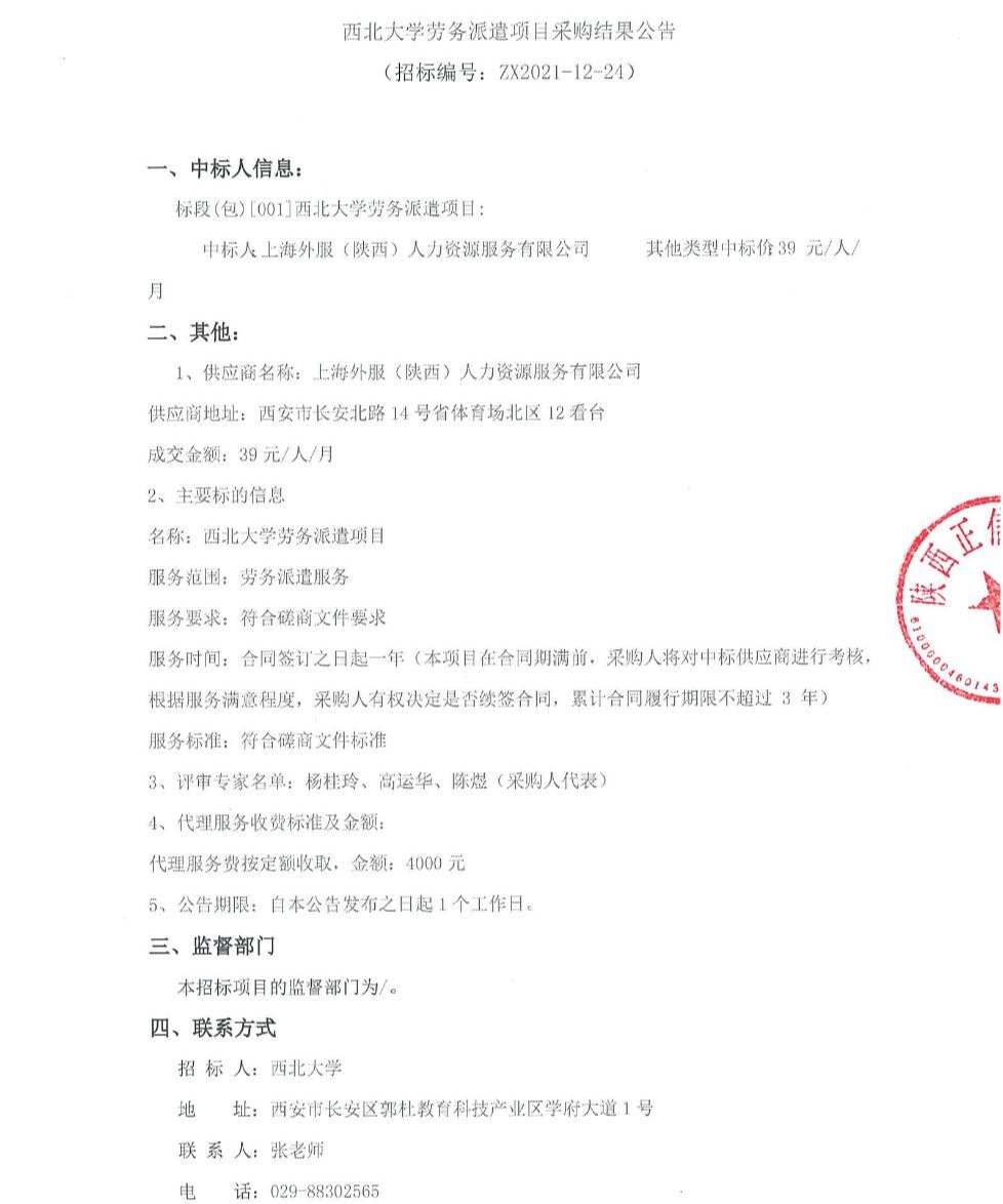 关于乐动网页版登录入口劳务派遣项目采购结果公告