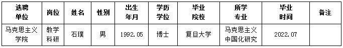 经用人单位推荐,人力资源部审查,学校教学督导及院系相关专家考核,我校拟确定下列人员来校工作。本着公平、公正、公开的原则,现将本次拟选聘人员基本情况公示如下: