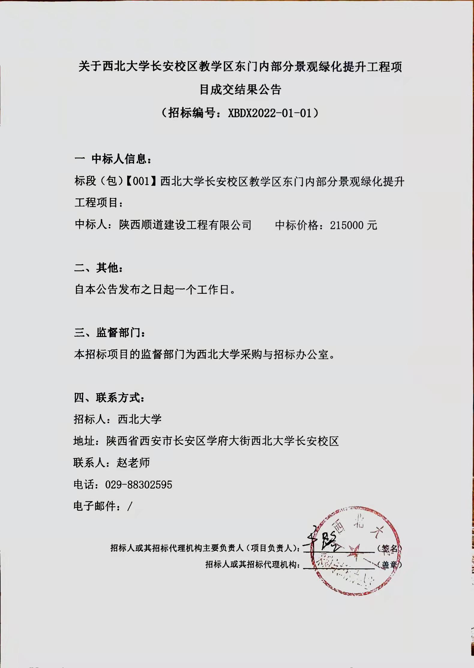 关于乐动网页版登录入口长安校区教学区东门内部分景观绿化提升工程项目成交结果公告