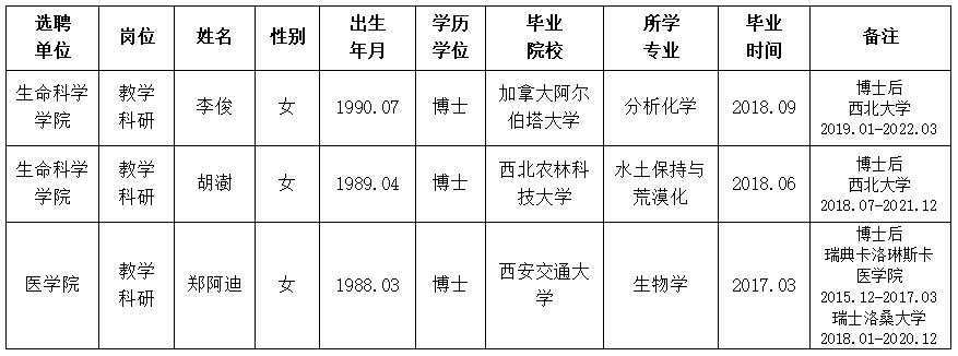 经用人单位推荐,人力资源部审查,学校教学督导及院系相关专家考核,我校拟确定下列人员来校工作。本着公平、公正、公开的原则,现将本次拟选聘人员基本情况公示如下:
