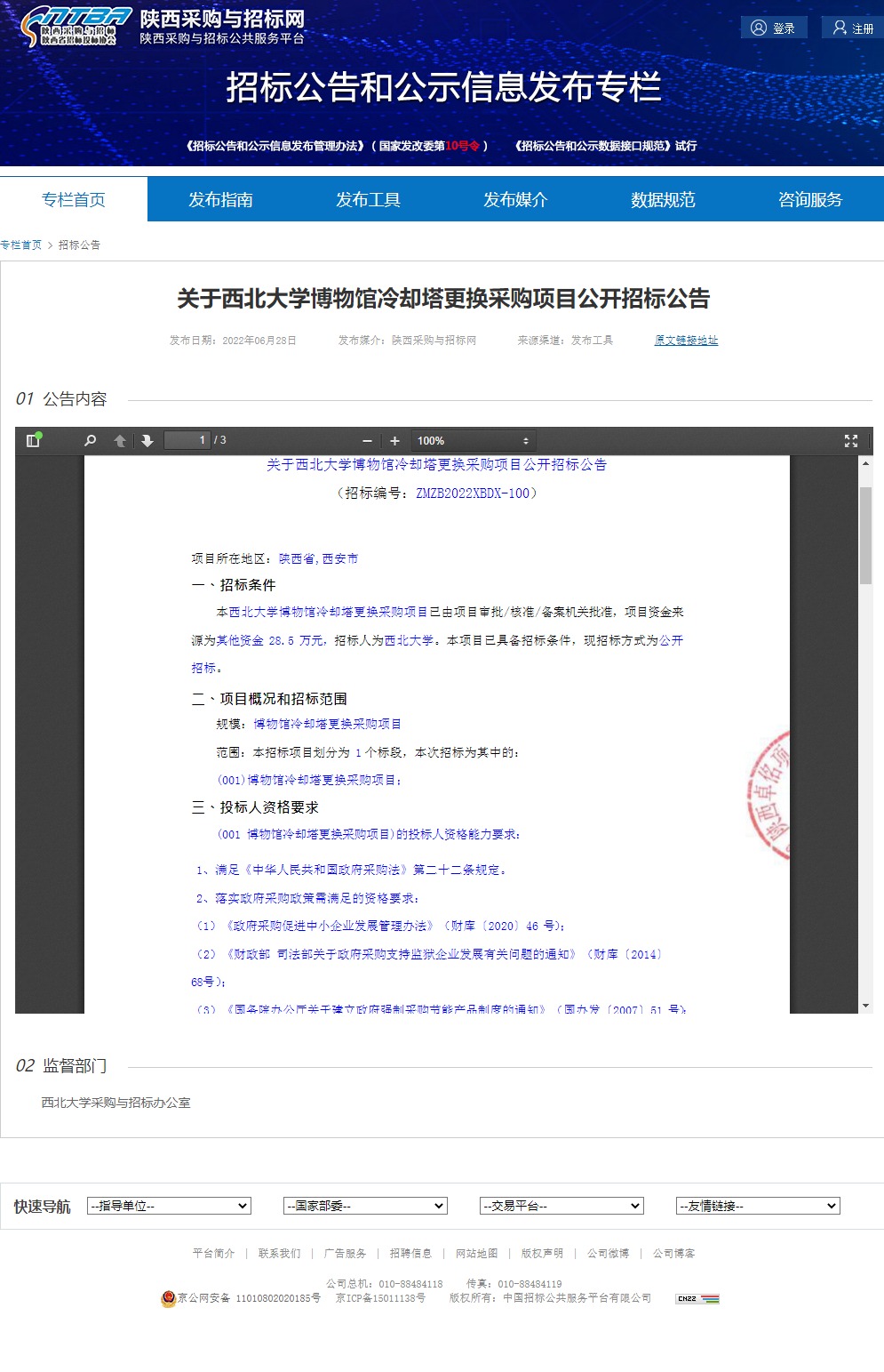 关于乐动网页版登录入口博物馆冷却塔更换采购项目公开招标公告 作者: 编辑:采购与招标办公室 时间:2022-06-28 原公告链接:http://bulletin.sntba.com/biddingBulletin/2022-06-28/439809.html