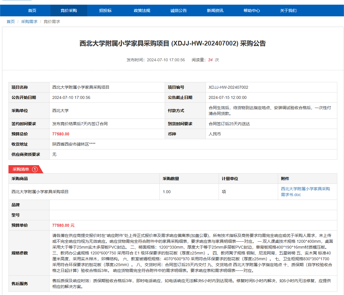 乐动网页版登录入口附属小学家具采购项目 (XDJJ-HW-202407002) 竞价采购公告 作者: 编辑: 时间:2024-07-11 原公告链接:https://www.ejingcai.com.cn/site/bidding/detail/11607