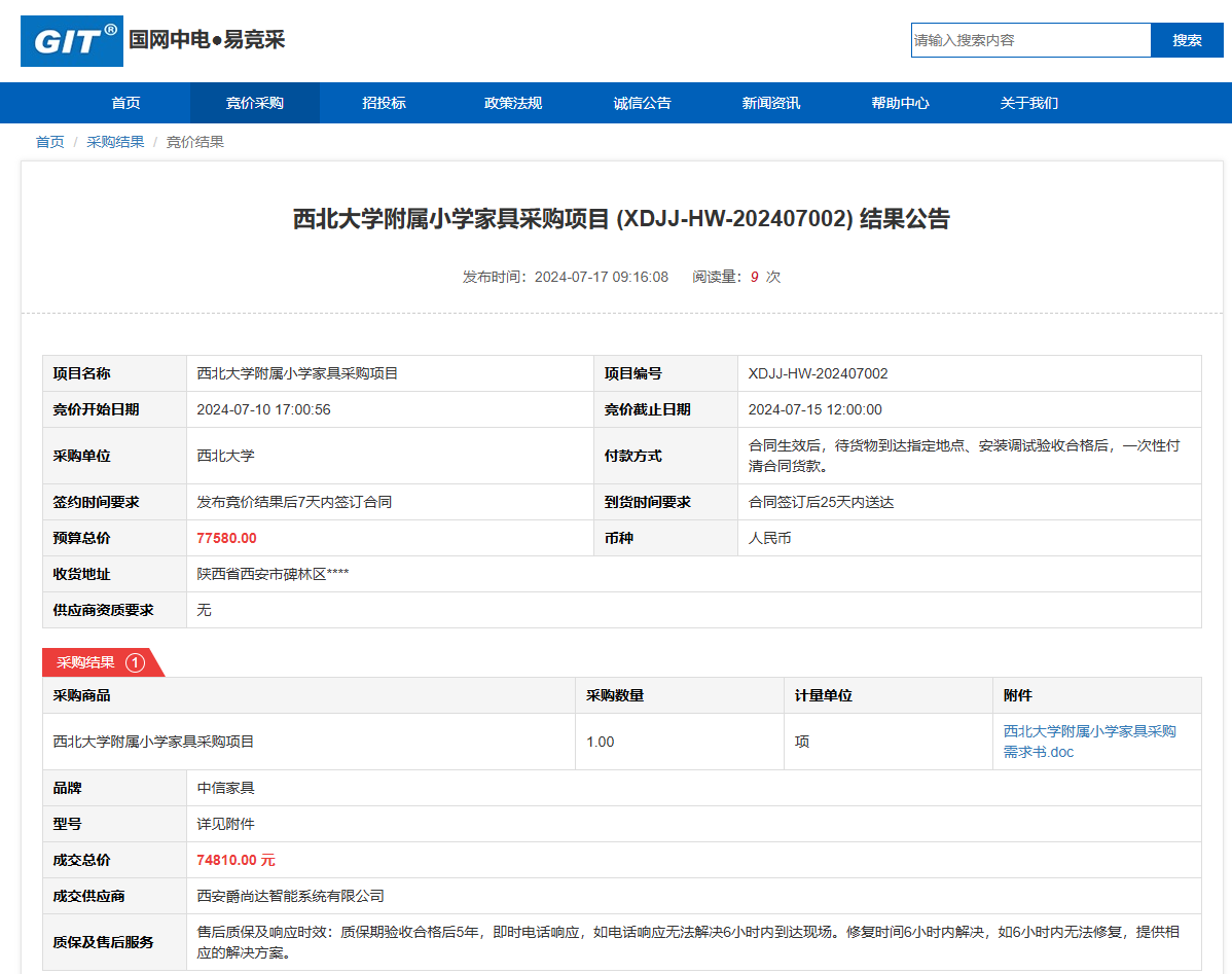 乐动网页版登录入口附属小学家具采购项目 (XDJJ-HW-202407002) 竞价结果公告 作者: 编辑: 时间:2024-07-17 原公告链接:https://www.ejingcai.com.cn/site/bidding/detail/11713